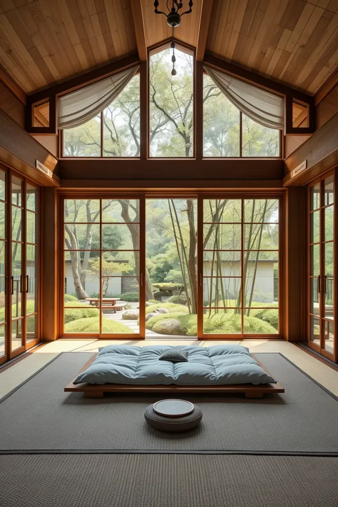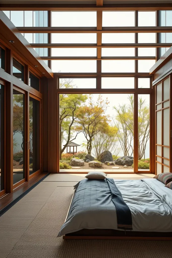 A Japanese bedroom escape would mean there is a connection of the outdoor in the bedroom itself. I have a tendency to use huge windows with wooden frames or even sliding glass doors leading to minimalistic gardens or bamboo courtyards. This continuous transformation between inside and outside produces calmness and enhances the zen-like experience. The visual experience of the moss, gravel or even a small pond automatically calms mind.