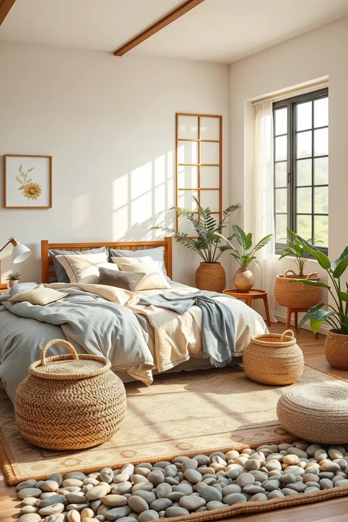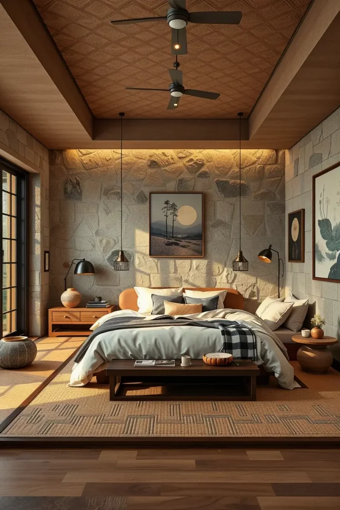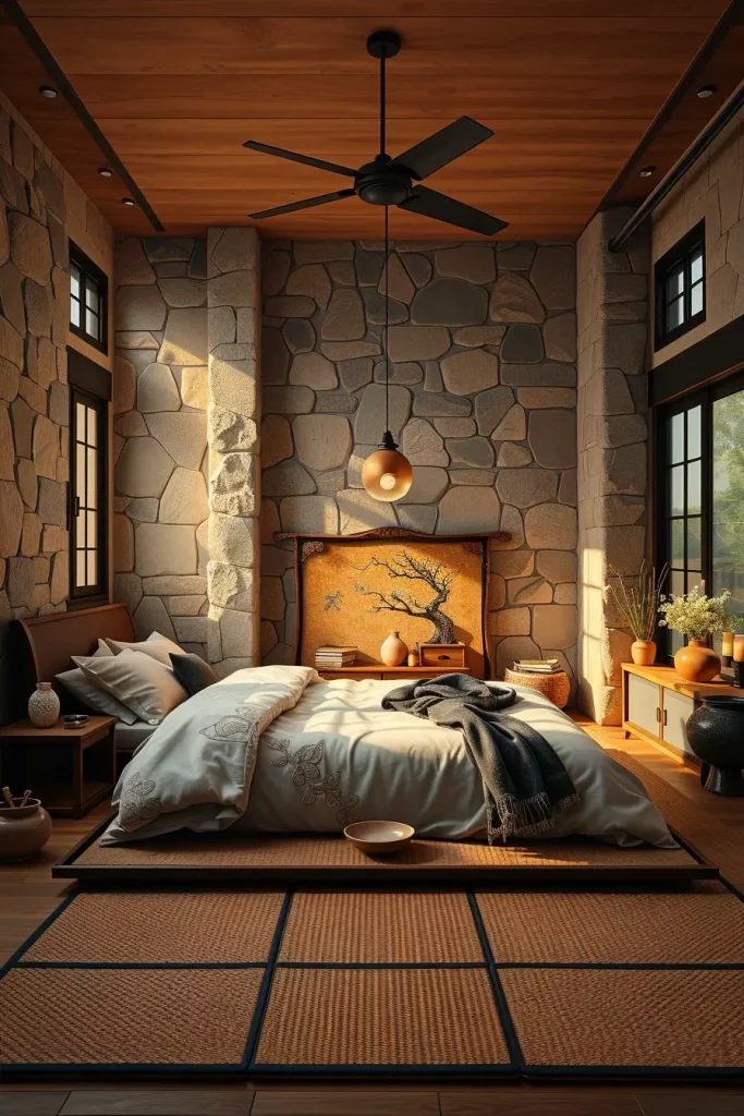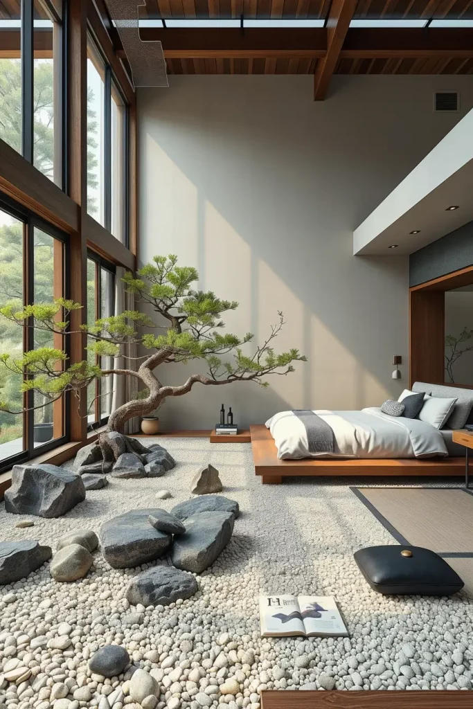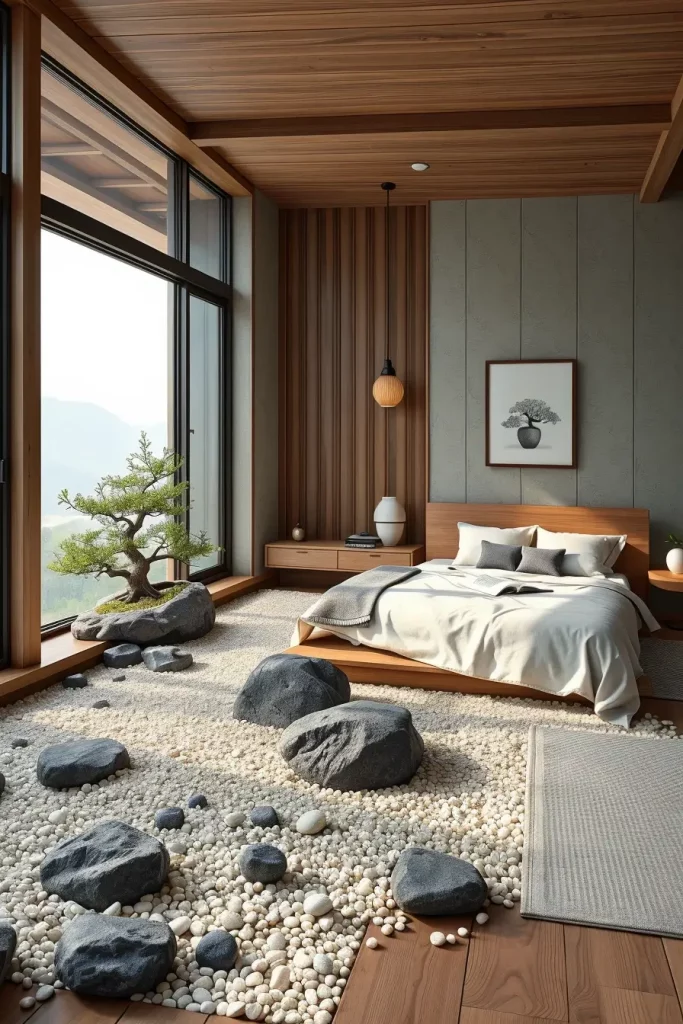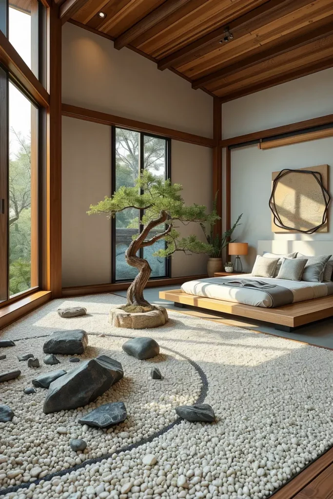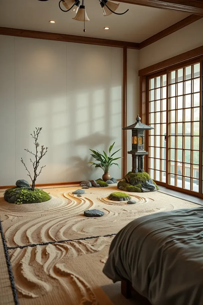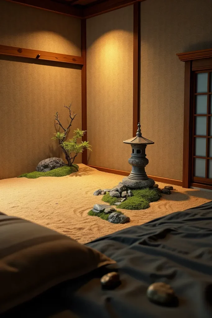 Here, I introduce an unexpected twist to bedroom design—a miniature karesansui (Zen rock garden) installed beside the sleeping area. It does more than just turn into a visual focal point; sand patterning likewise provides actual psychological health advantages, as one meditates by raking over its patterns. It can be marvelous when one is tired of the day or decides to find something to calm down at the end of it or in the morning.
