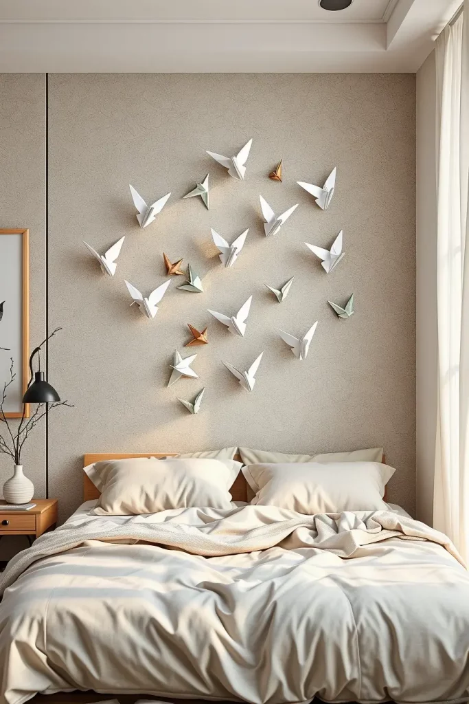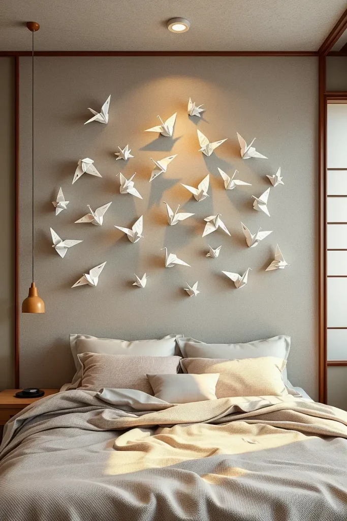To interlace the artistic work with a peaceful room, I resort to the Origami wall art. Its sharp edges and light folds are associated with mindfulness, discipline and beauty. I am crazy about mounting minimal paper cranes or butterflies or even lotus flowers in soft shades on a feature wall. These artworks create the visual rhythm and stimulate wondering without bombarding the space.
