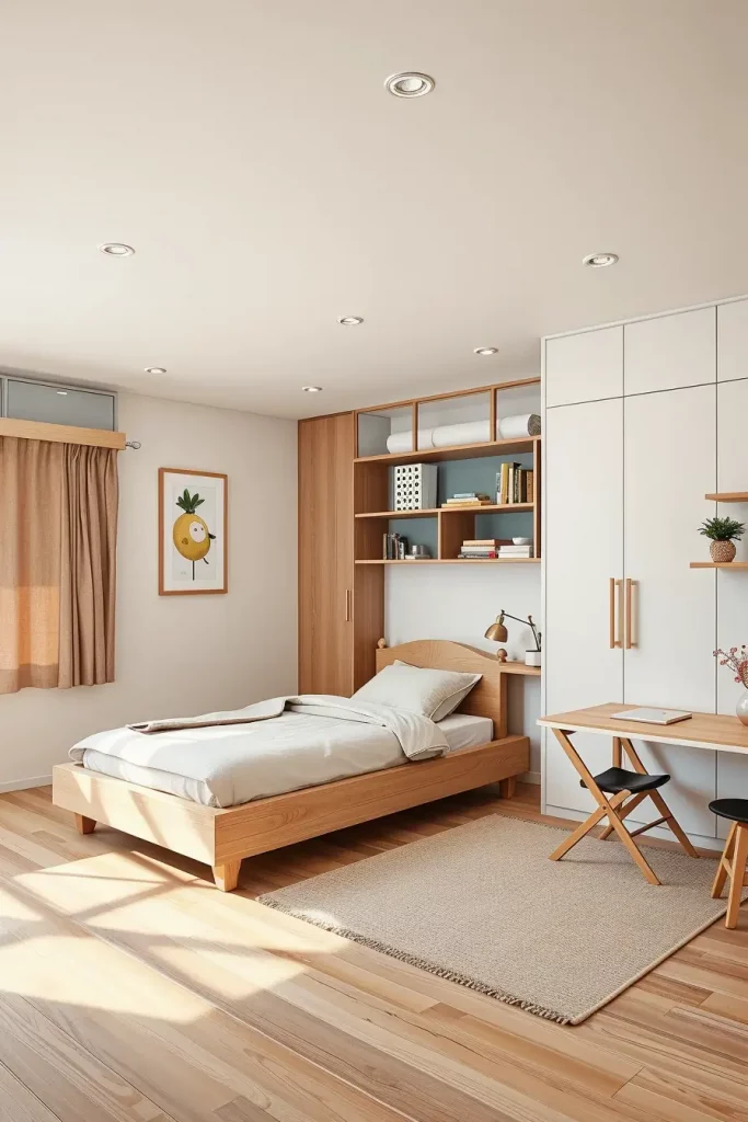 Minimalism to achieve functionality is one of the rules I follow when choosing a Japanese design, and modular furniture allows it. When confronted with very small bedrooms, I prefer low-lying furniture that has more than one use. In this case think of storage chests which can be used as a bench, collapsible writer or a nightstand, which could fit in a recess.