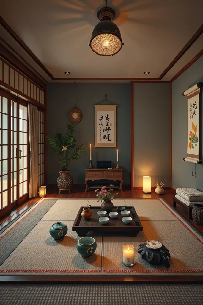 I choose hand-made teacups, clay teapot, and wooden serving tray. Near one of them was a small scroll or ikebana arrangement that adds to the cultural setting. The lights must not be harsh; perhaps there is a candle, a piece of paper lantern to make the mood.