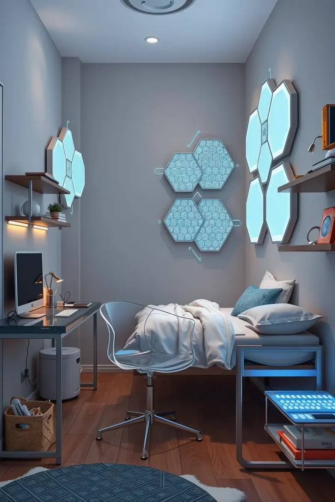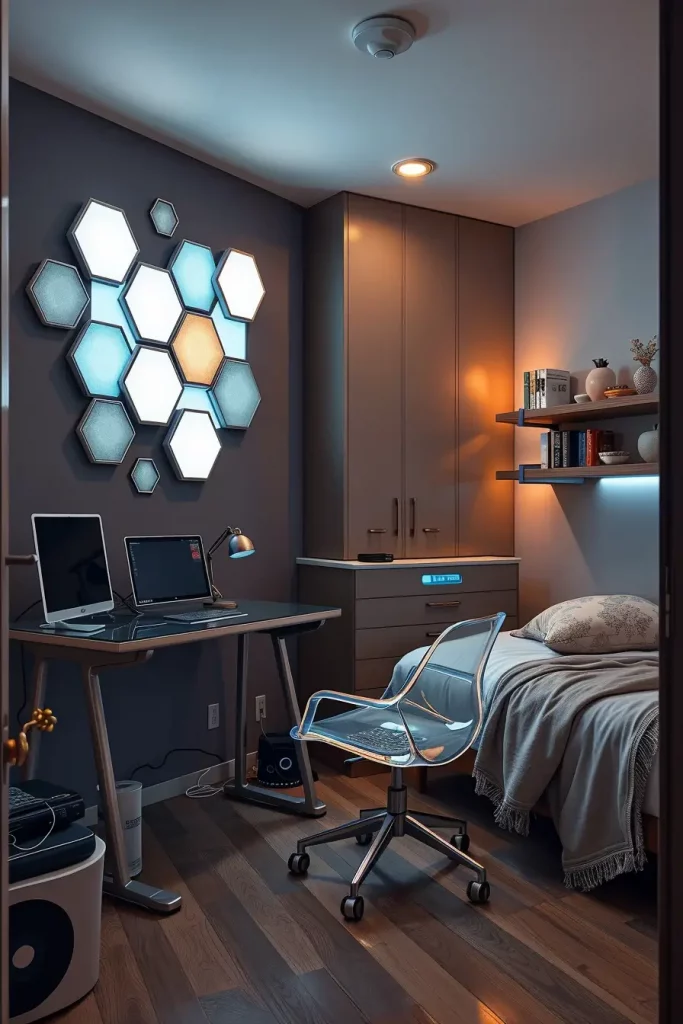 The most common are hexagonal or modular LED panels, customarily arranged around desks or beds. A light show can be activated by touching a single segment, or it can be synchronized with Spotify. This is surrounded by minimalist furniture, generally, to avoid distracting attention away form the illuminated art piece; such as clear desks, ghost chairs, and metal-framed beds.
