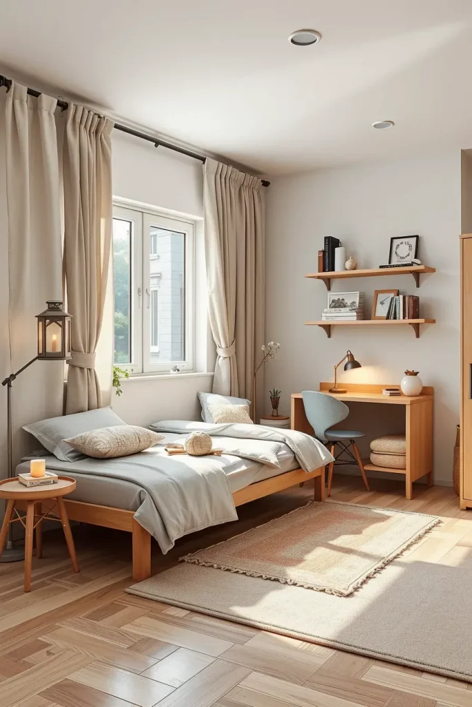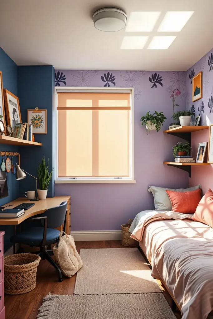 Color-zoning, or creating the different zones of a small room with the help of color psychology, is one of the most helpful trends I have applied in 2025 dorms. Depending on the paint and textile materials, the same area serves as a study area, a sleeping area, and a self-care haven.
