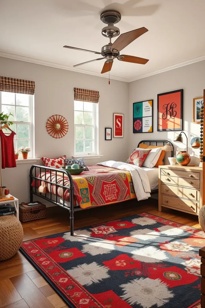 Such rugs are most often put in the middle of the room or under the bed, which makes the area visually delineated. Typical furniture is metal framed beds, white dressers and floating night stands. The place appears lively and one of a kind because of bold red, black-and-white, or moss green rugs. A rug turns out to be the attribute of the room even when it is neutral.
