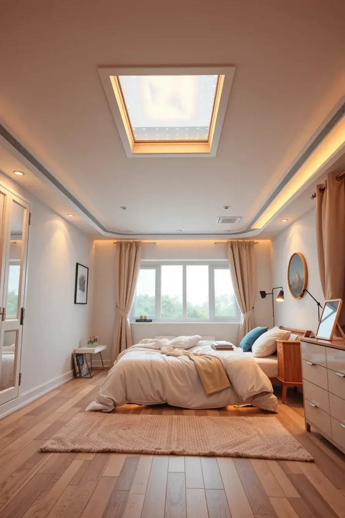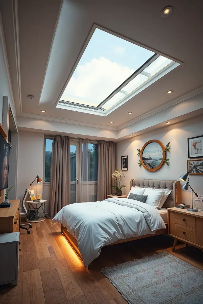Systems typically consist of a primary over-head panel, plus supplementary desk or bedside lighting. Such skylights frequently have remote controls or app control and reading, sleeping or energizing color options. I tend to mix them with light bedding, light wood floors, and White storage to maximize the glow.