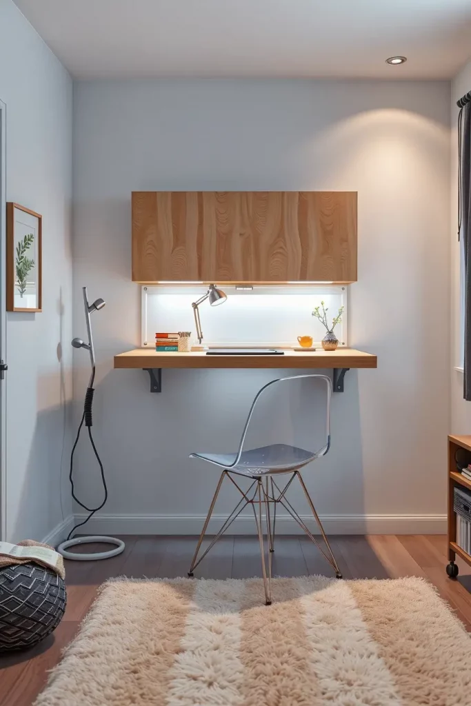 I’ve seen desks made from sleek birchwood panels that mount via adhesive brackets (no drilling required), complete with slim drawers and under-desk LED strips. One of them even incorpored a whiteboard surface into the underside — fold it up and now you have your study notes on that white board. These should be coupled with a transparent acrylic stool or a folding chair to ensure that things remain open and contemporary.