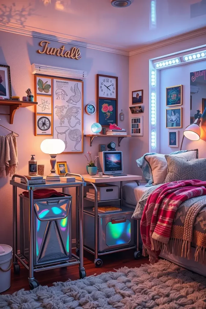 I have seen peel-and-stick chrome decals which students apply to their closet doors or headboards. The vibe is also provided by iridescent organizers, translucent holographic bins, and chrome-legged shelves. Apply these details in moderation so as not to overload the eyes. My recommendation? To balance things out, a chrome floor lamp and one huge iridescent pillow matched with a neutral duvet.