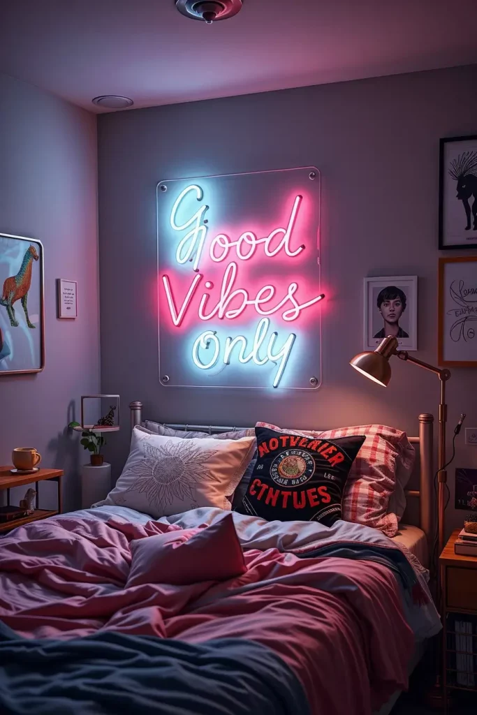 The year 2025 is seeing the end of keeping neon in the clubs and introducing it to the most comfortable spaces in college dorms. They are not clever glass tubes — dorm-safe neon art is currently produced with flexible LED strips, which produce a warm, aesthetic light with no heat or danger. It can be a cursive Good Vibes Only above a headboard or a pink lightning bolt by a mirror, but one way or another, neon details add personality and oomph to small rooms.