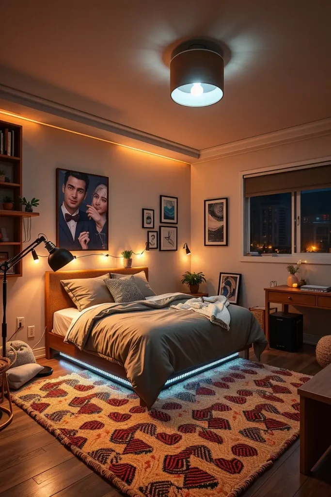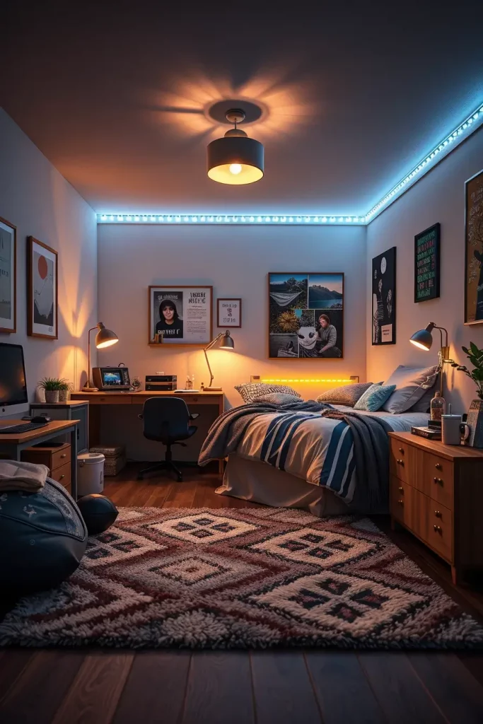 Begin with a fashionable overhead light – preferably one which can be dimmed. Start with a task lamp to study by, followed by some mood lighting; a bed strip or a wall sconce. To add a designer touch, however, some dorm residents are now using smart bulbs to adjust color temperature according to the time of day. you would be surprised at the improvement in your sleep and study rhythms.