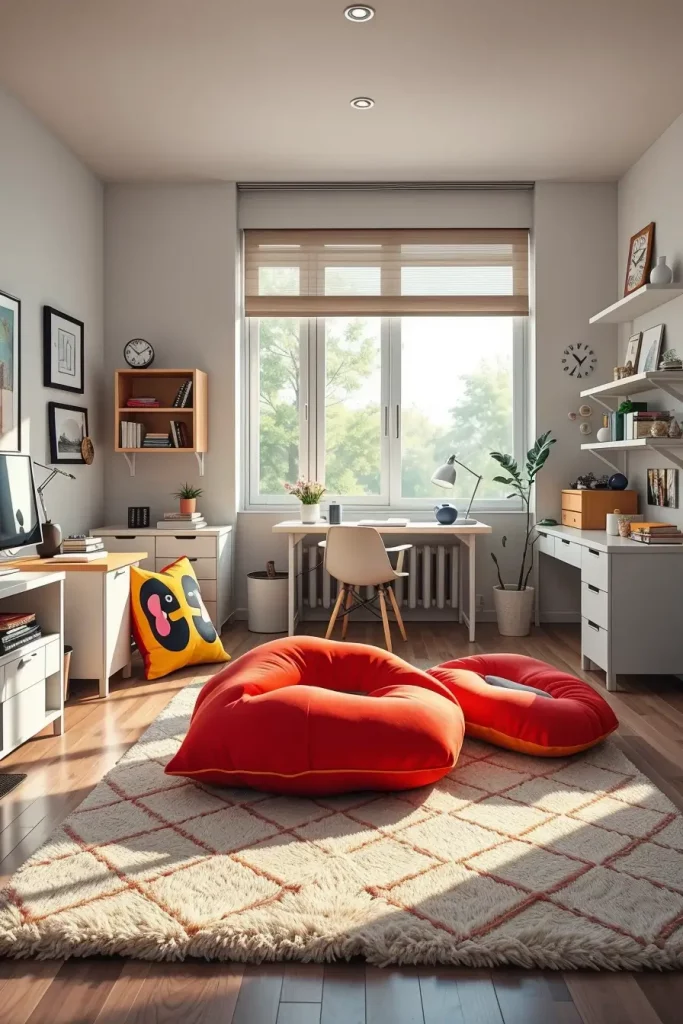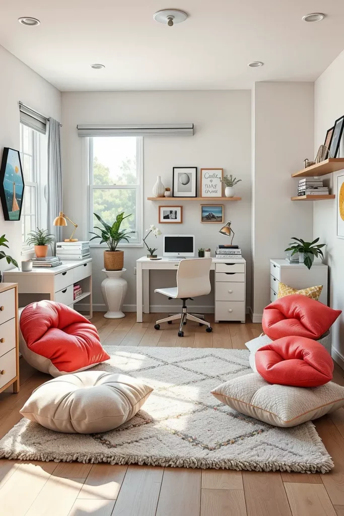 Every pillow or sculptural soft object performs its own visual and practical objective. Imaginate asymmetrical floor cushions, tufted blobs in abstract shapes or lips and cartoon eyes in cheerful colours. These are great on beds, window seats or lounge chairs and particularly effective in rooms which do not have a lot of color in other areas. The rest of the furniture in these accents tends to be kept quite refined, white modular beds, floating wall shelves, and slim desks to ensure the focus is on the decor.