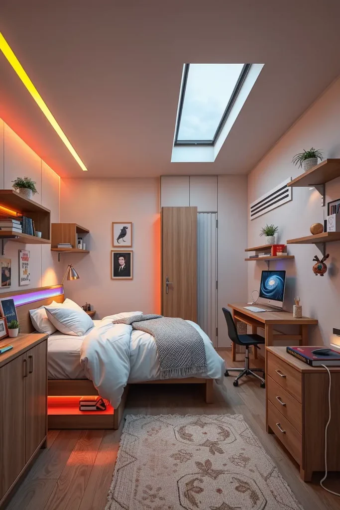Necessary features are voice-controlled LED strips, layering task lights in shelves, and accent lighting in mirrors and storage cabinets. Up-scale dorm arrangements also incorporate diffused light panels behind headboards and or around dorm-safe fireplaces. Most kits are sold with sticky channels to conceal wires, giving a neat finish. Combine this installation with a neutral bedding and light oak furniture to make the lighting installation shine, literally.