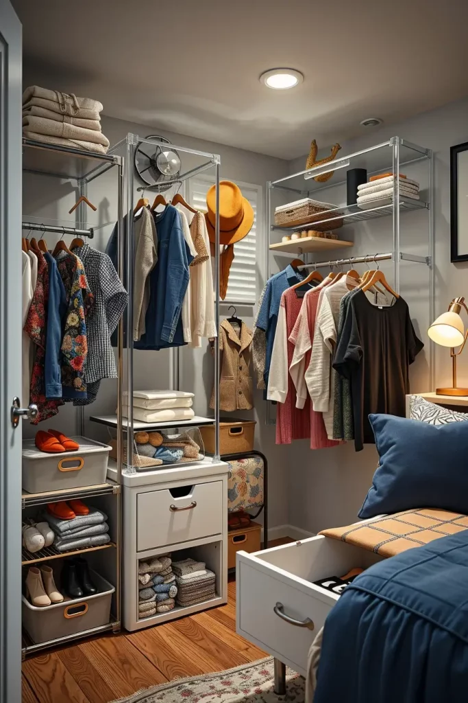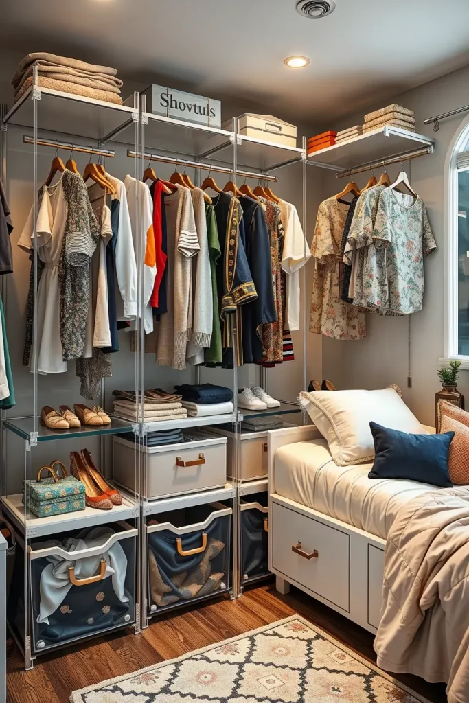 I tend to suggest stackable towers with chrome accents and slide out drawers. Combined with rolling containers under the bed and acrylic boxes labeled, the appearance is neat, fashionable and practical. This trend goes well with open hanging racks and light-colored wardrobes to balance the space.