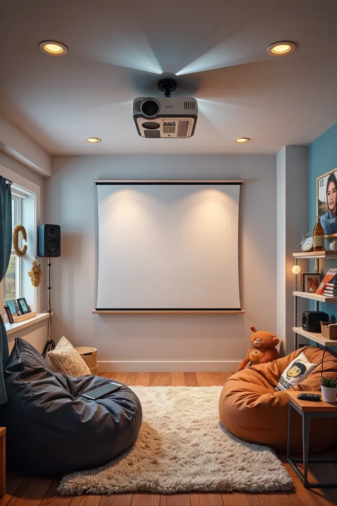 I frequently recommend ceiling mounted mini projectors with folding white screens or bare white walls over desks. Seating: There is a soft Area rug, beanbag chairs, and extra-large floor cushions. We even installed surround-sound Bluetooth speakers in the window frame in one recent installation, and ran cables through adhesive channels to keep the installation clean.