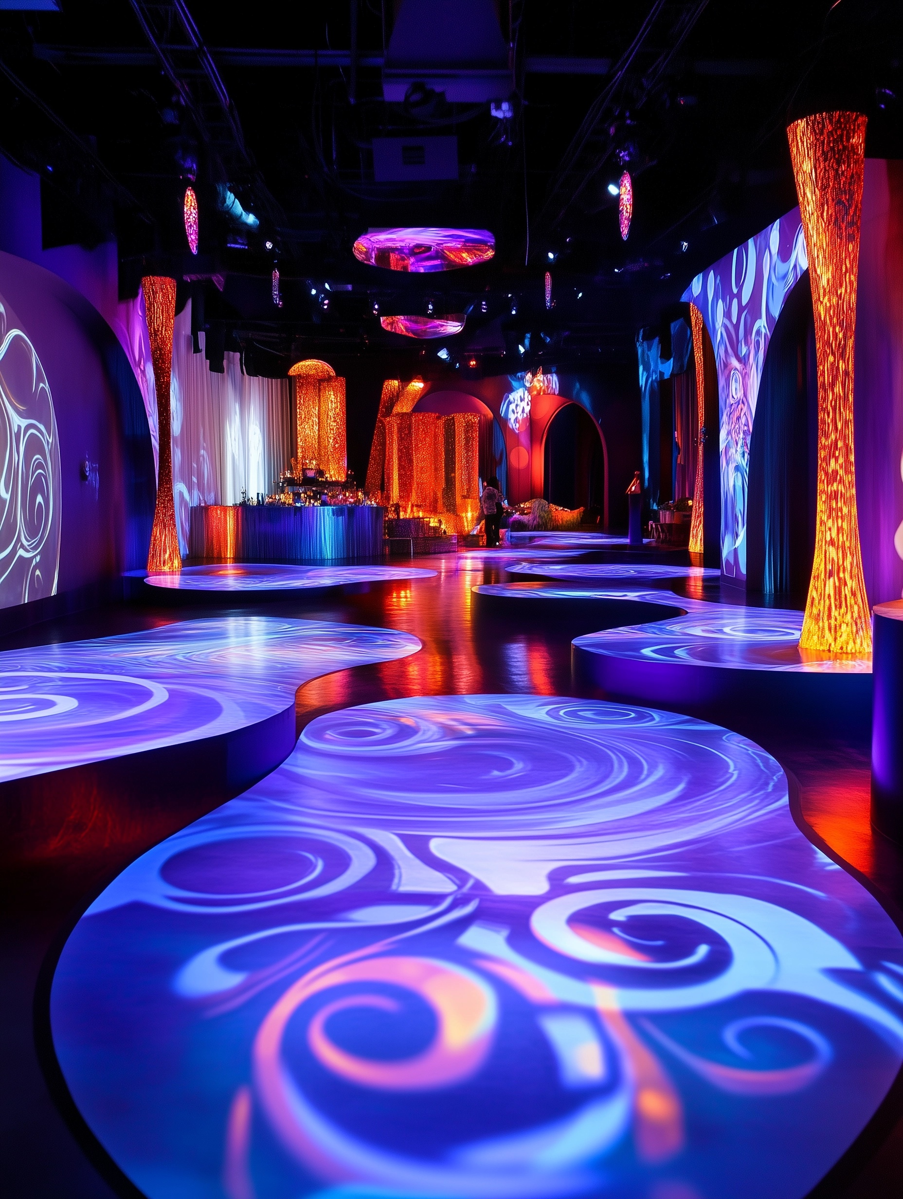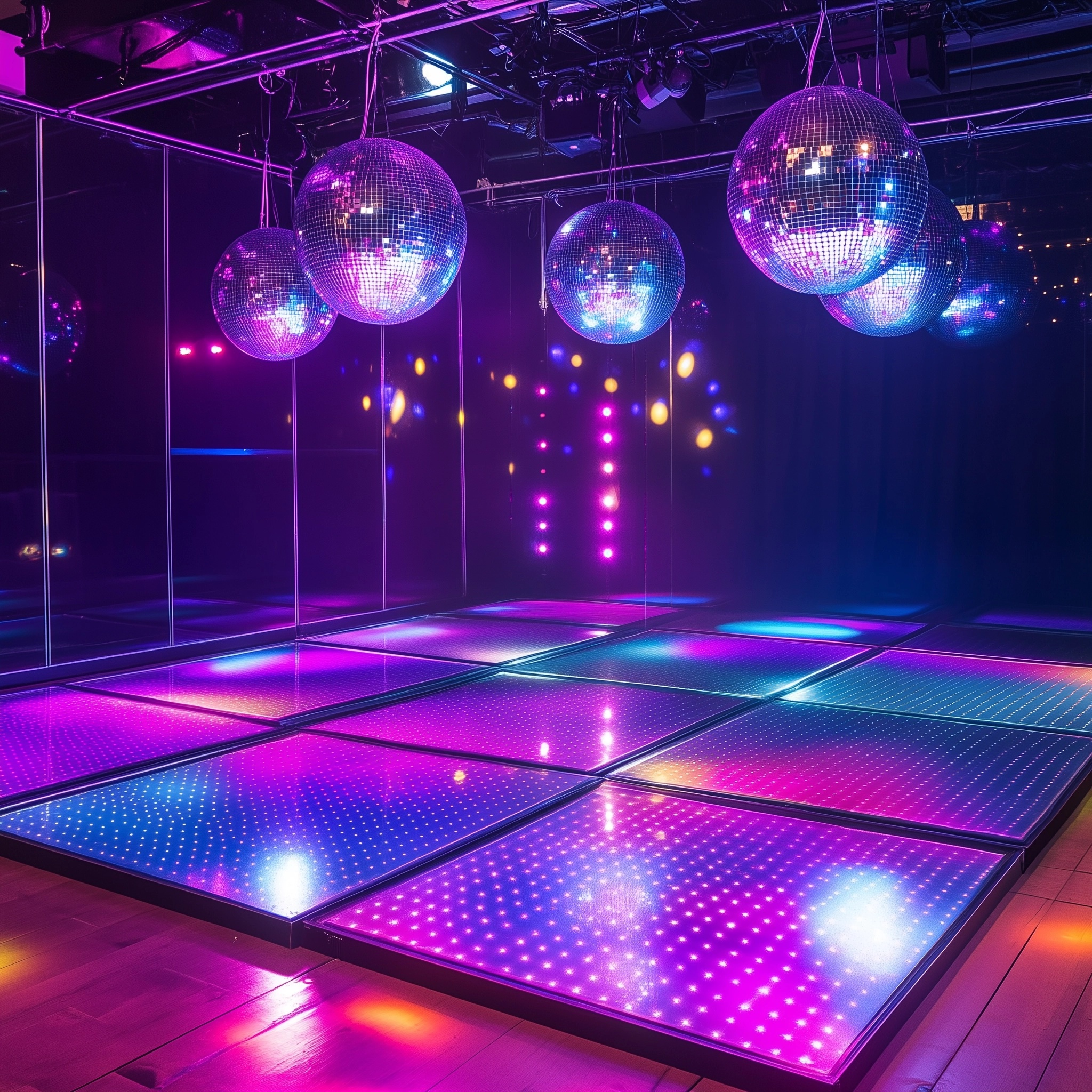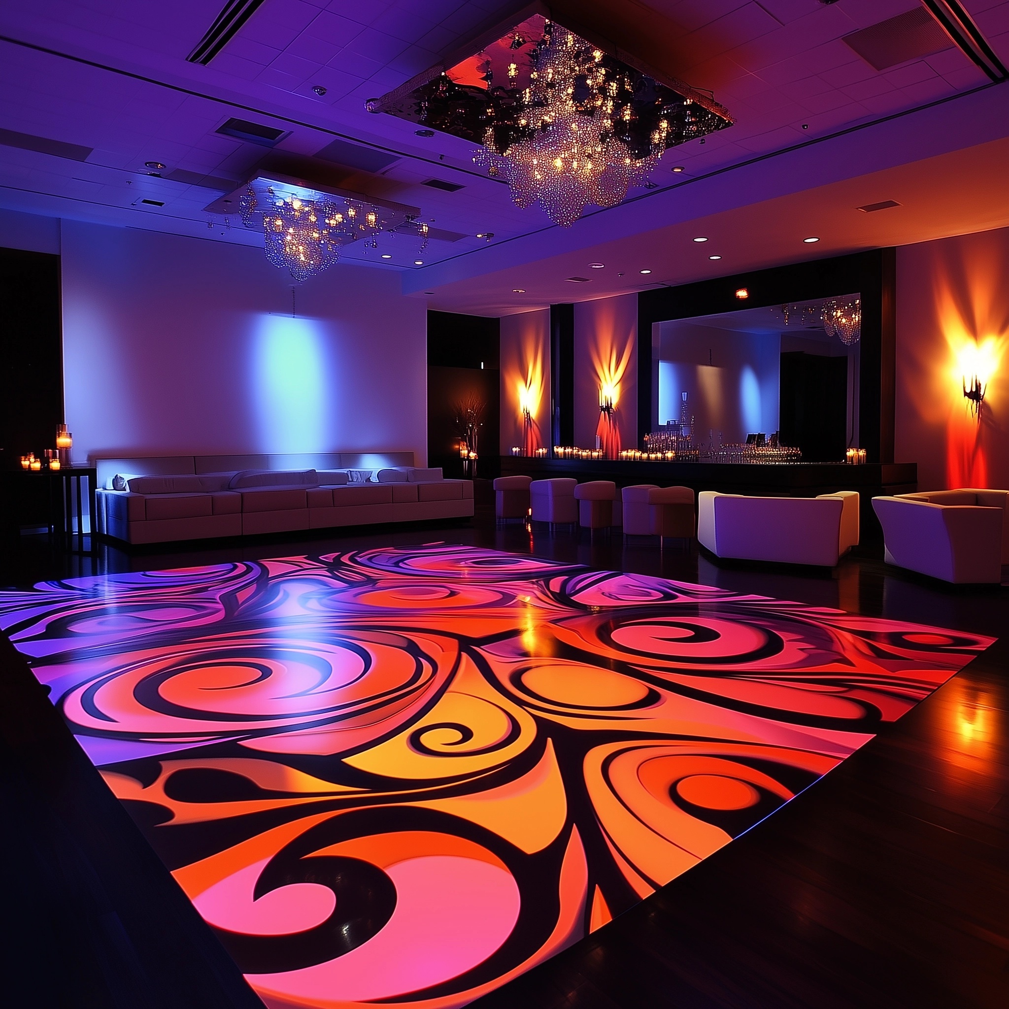 Building a consistent dance floor aesthete depends on the harmonious blending of various factors, for example, different kind of lights, colors used on the floor, and the decor, in order to achieve a compelling appearance. One viable approach is to put down a floor, which is neutral or weaved with understated patterns, that aligns with the thematic concept. Light effects should on the one hand enhance the overall atmosphere and on the other hand, be integrative to other design elements.