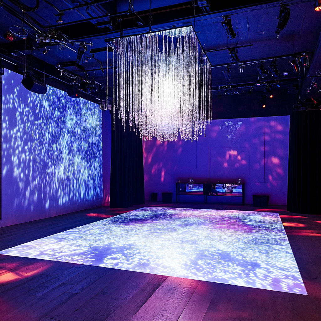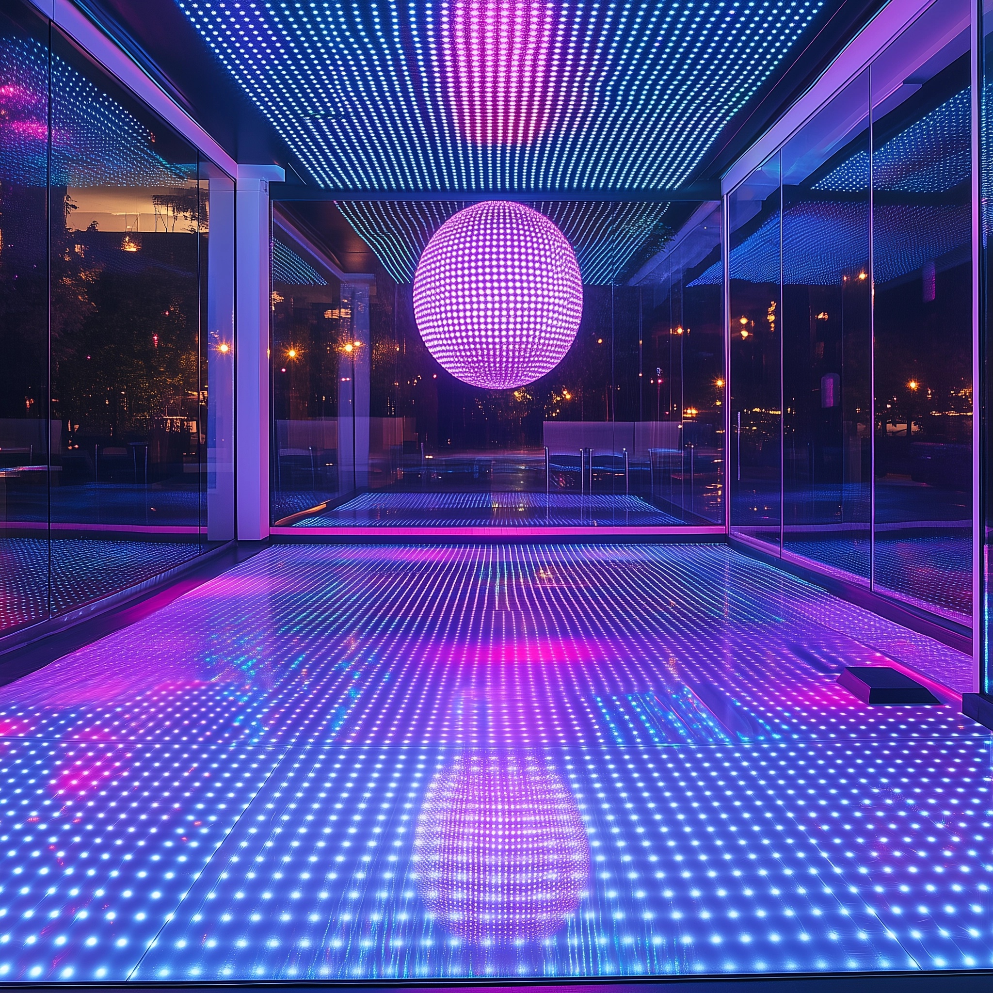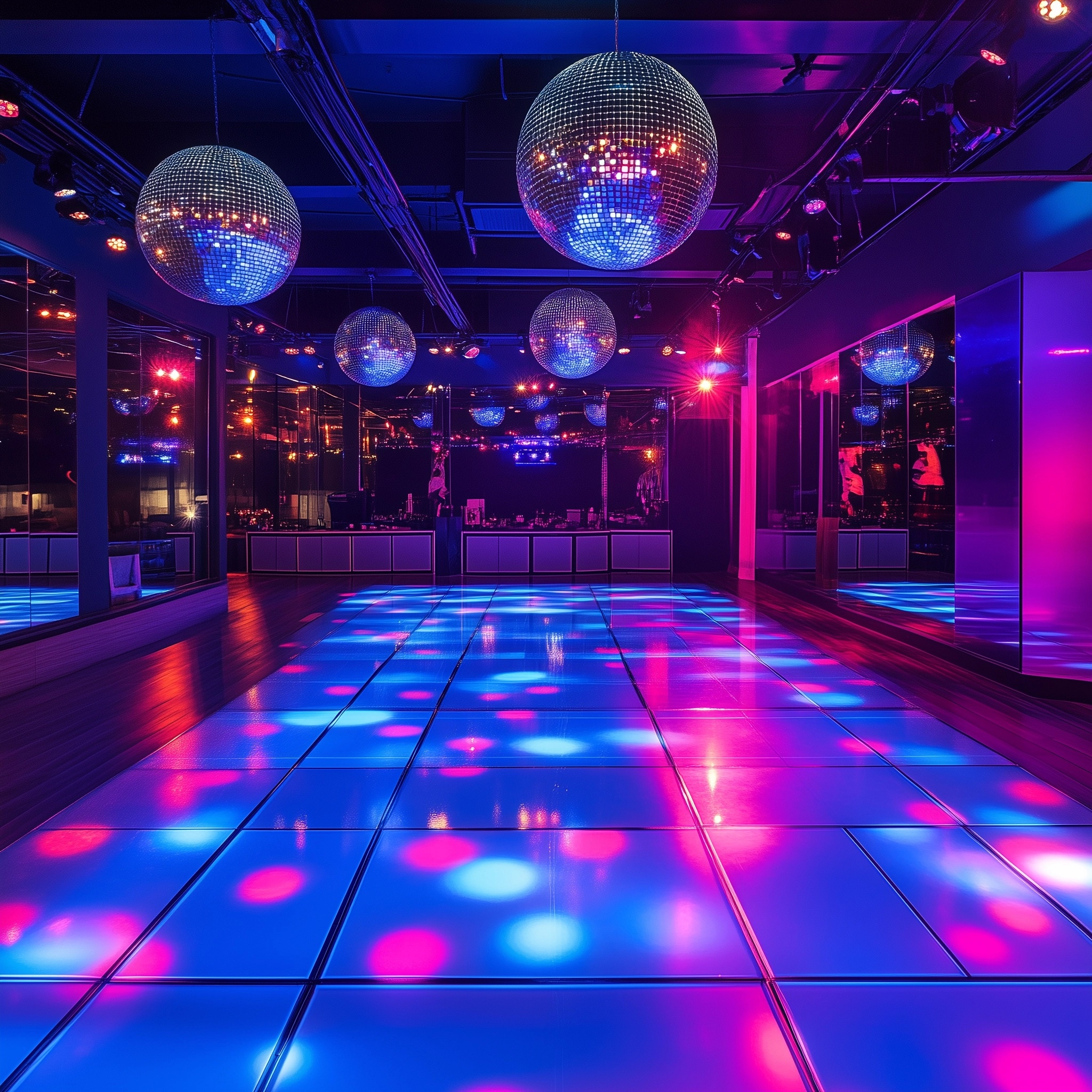 Building a consistent dance floor aesthete depends on the harmonious blending of various factors, for example, different kind of lights, colors used on the floor, and the decor, in order to achieve a compelling appearance. One viable approach is to put down a floor, which is neutral or weaved with understated patterns, that aligns with the thematic concept. Light effects should on the one hand enhance the overall atmosphere and on the other hand, be integrative to other design elements.