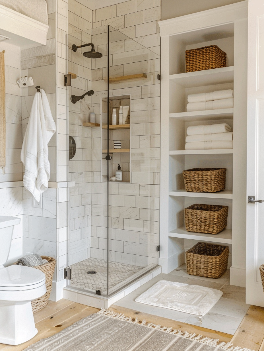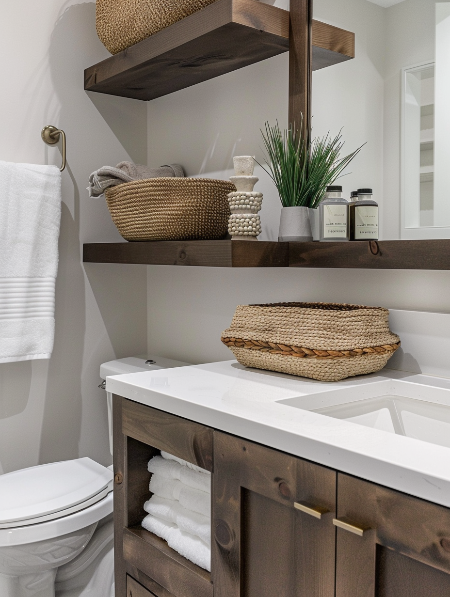 In small bathrooms open shelving is a practical and stylish option. Floating shelves on the toilet, by the vanity, or in the corners can be a good place to put toiletries, towels, and decor. This strategy ensures that things are within reach and at the same time, it visually opens the space. Besides, decorative baskets and boxes can be used to organize and beautify your bathroom.