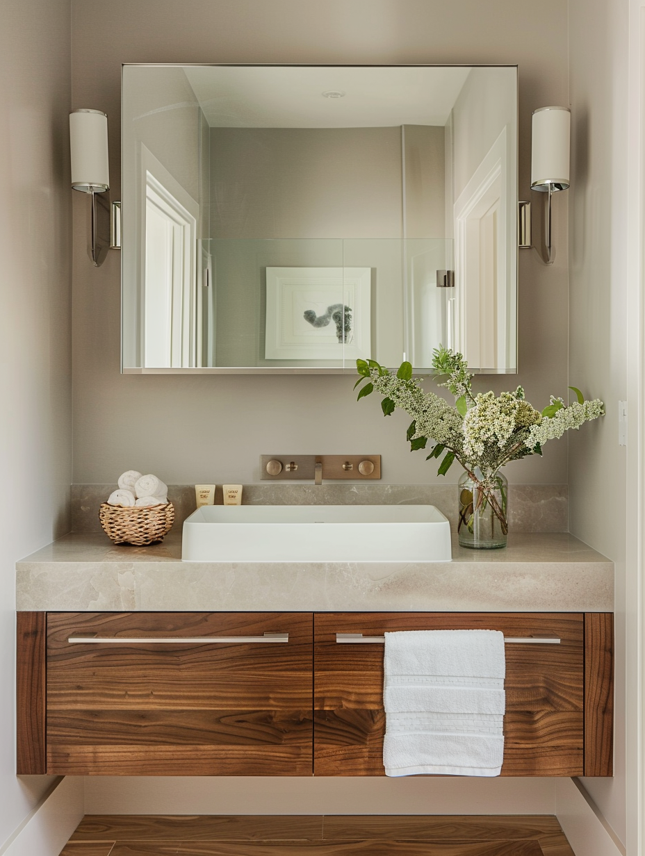 Showcasing different textures and materials is a very easy way to dress up a small bathroom. Blend smooth tiles of natural wood with light metal fixtures and soft textiles. The method makes up an interactive and warm zone, where each and every component supplements the other, which in turn creates depth without overshadowing the limited zone.