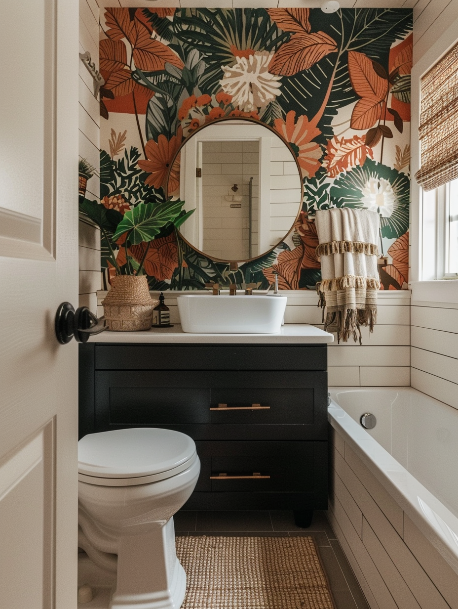 Wallpaper can introduce personality and emphasize the style of a small bathroom. Create a focal point with a bright and patterned accent wall. Make sure to choose moisture-resistant wallpaper so that the wall doesn’t get water damaged during the time. As you play around with different designs, let them create depth and character without causing tightness.