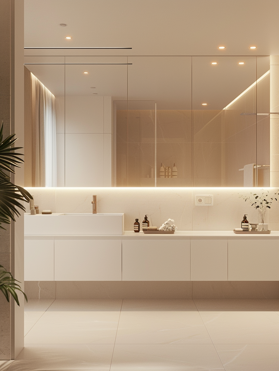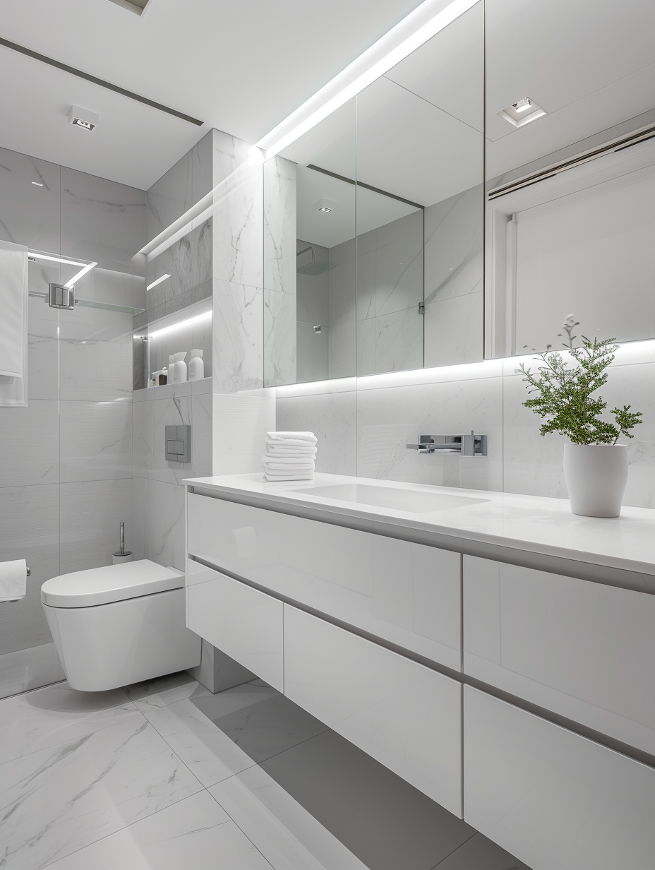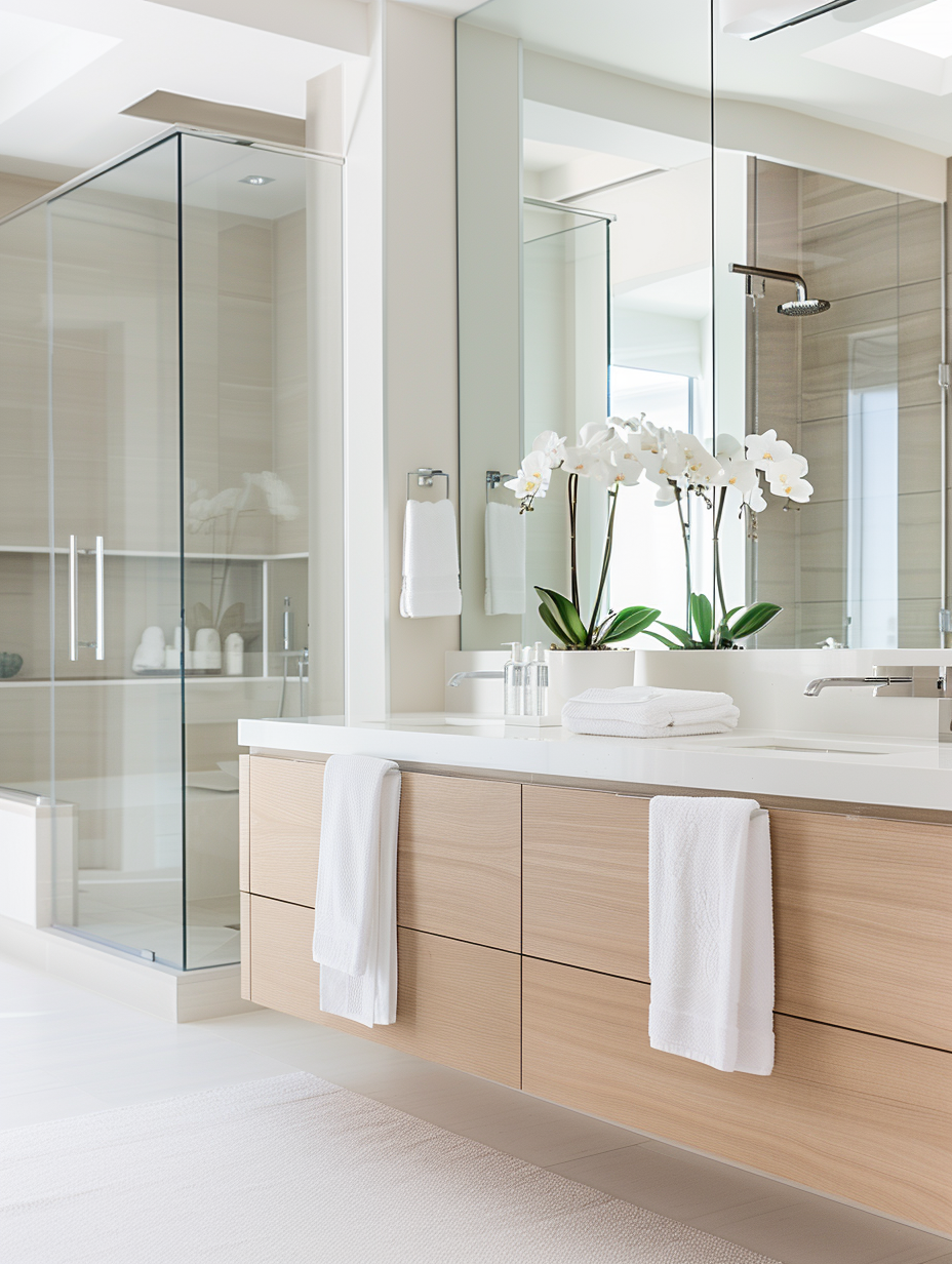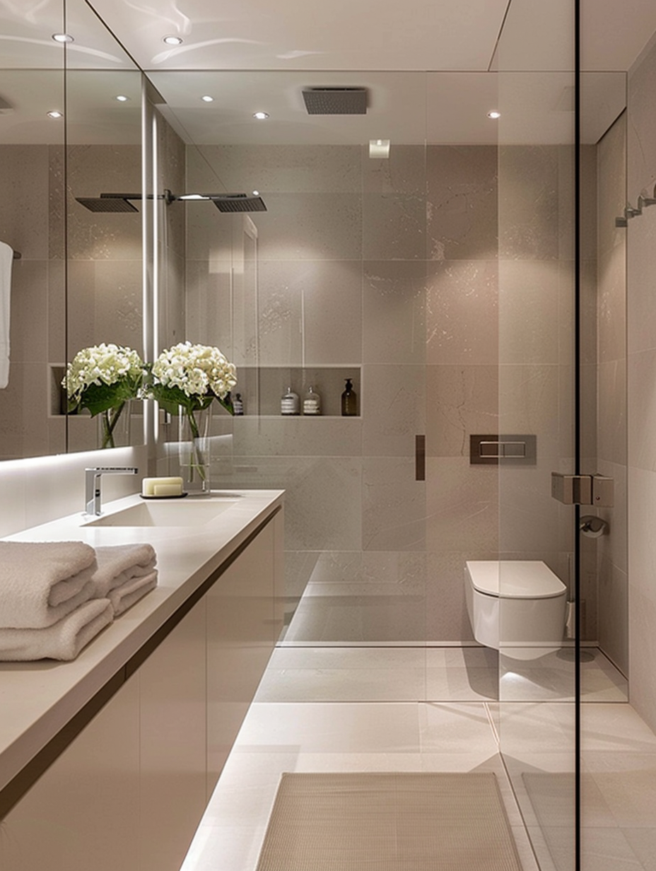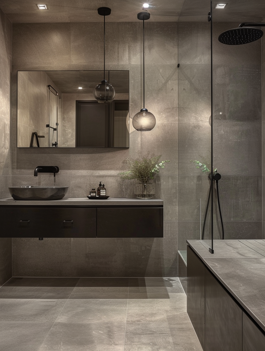 The minimalistic design is the one that consists of clean lines, simple shapes, and a monochromatic palette. This style brings peace and quiet into the room and makes it easier for users to relax. Opt for sleek fixtures, frameless mirrors, and hidden storage solutions to maintain a minimalist and peaceful appearance. A few well-chosen accessories can add personality without overwhelming the space.