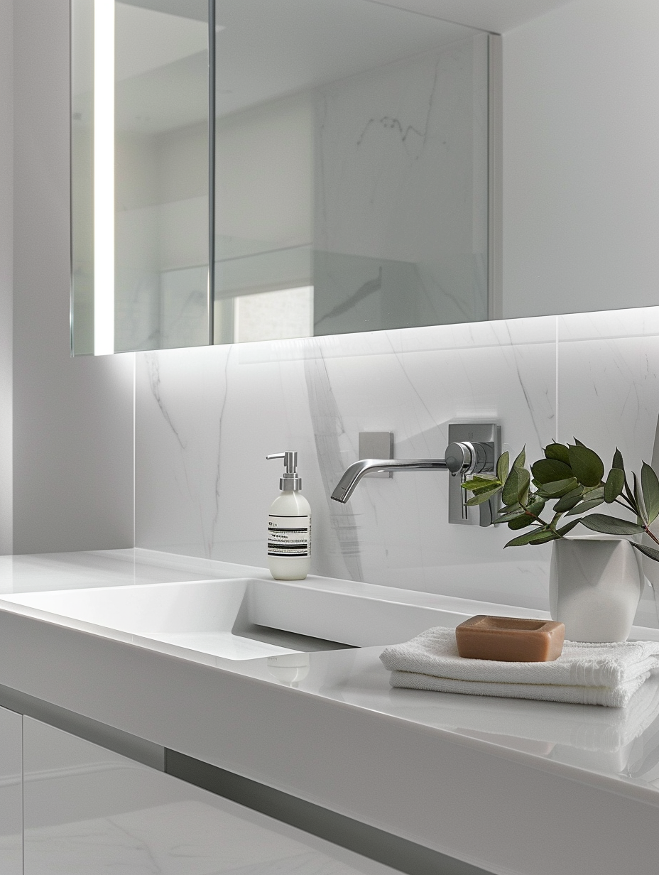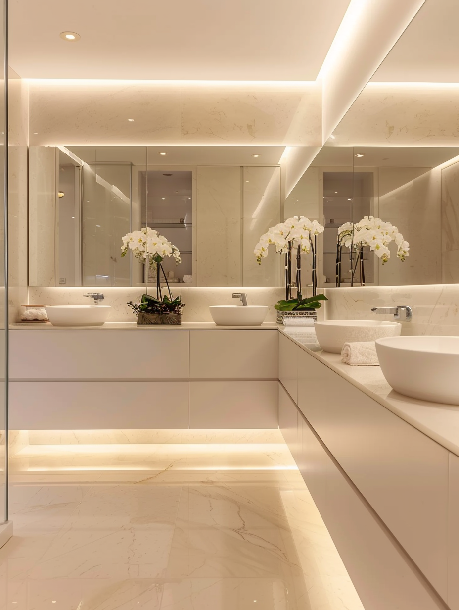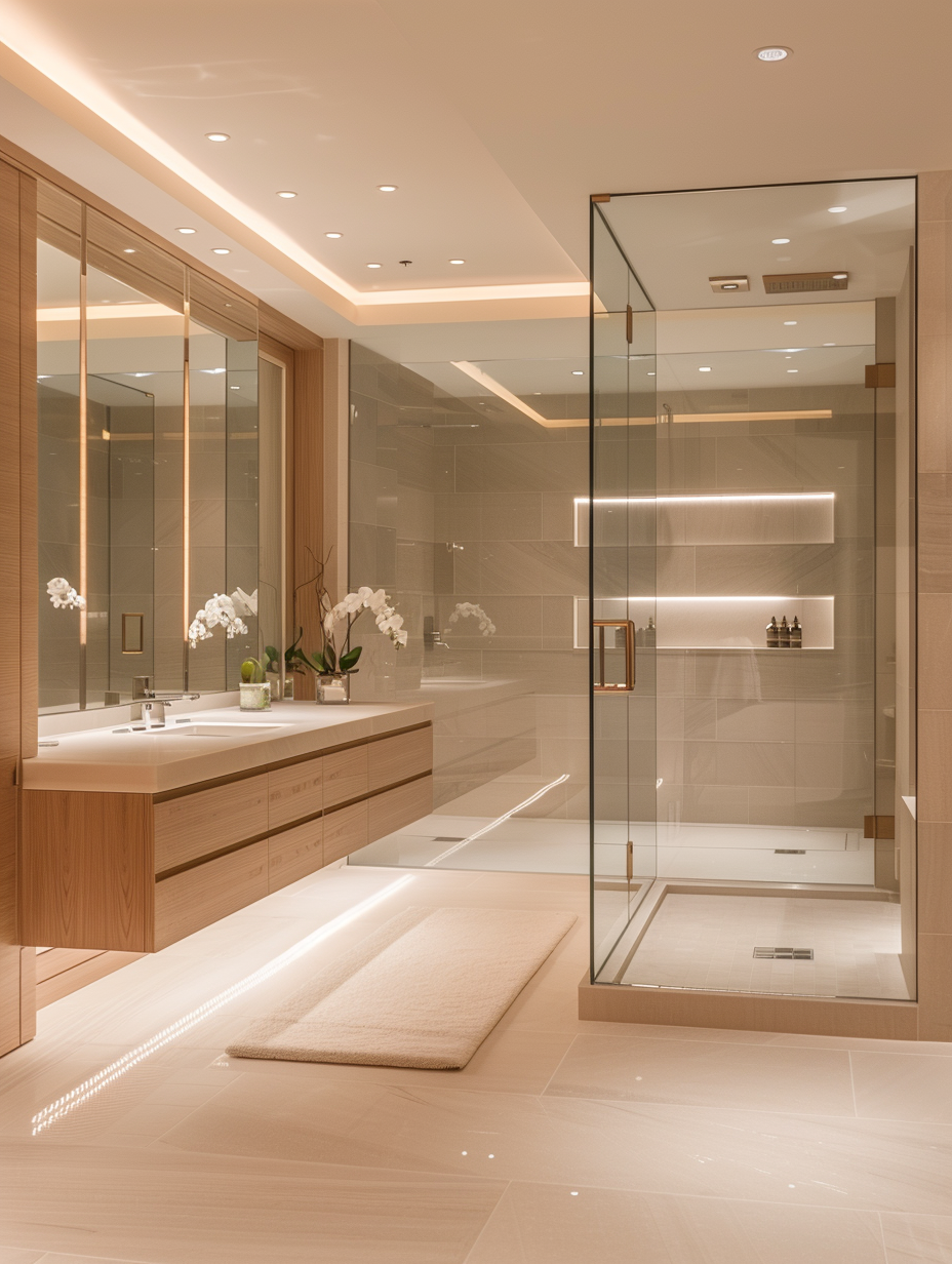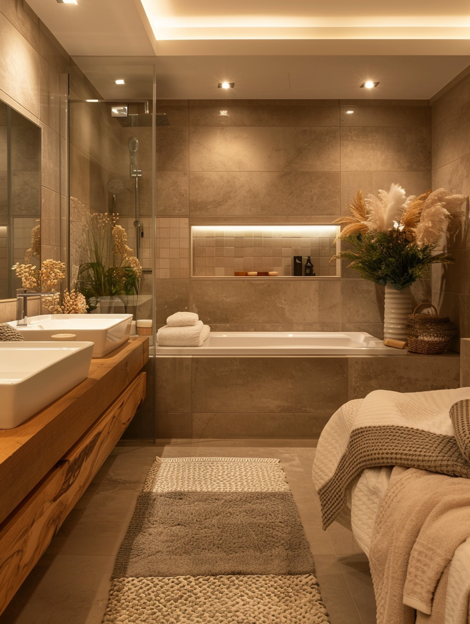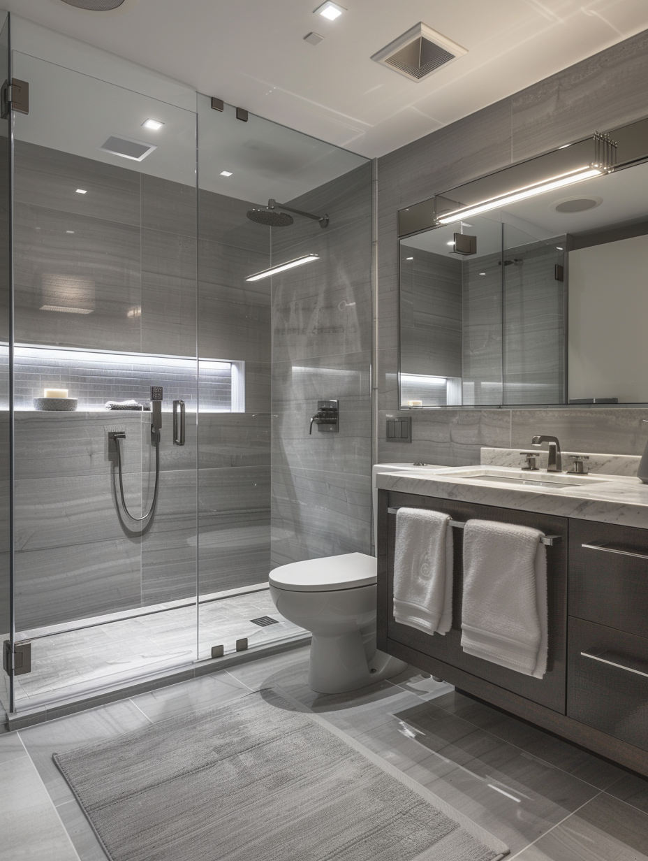 The minimalistic design is the one that consists of clean lines, simple shapes, and a monochromatic palette. This style brings peace and quiet into the room and makes it easier for users to relax. Opt for sleek fixtures, frameless mirrors, and hidden storage solutions to maintain a minimalist and peaceful appearance. A few well-chosen accessories can add personality without overwhelming the space.