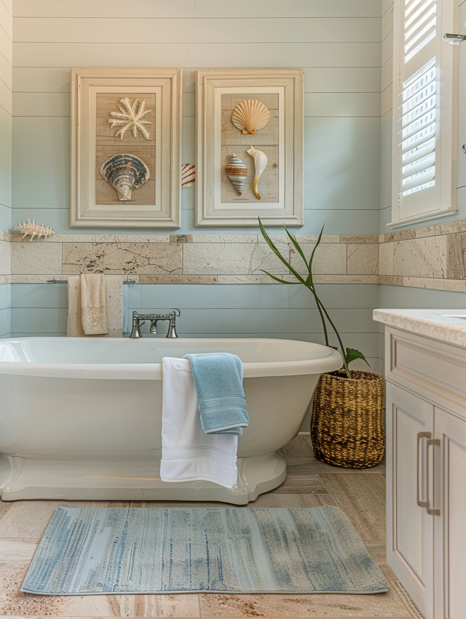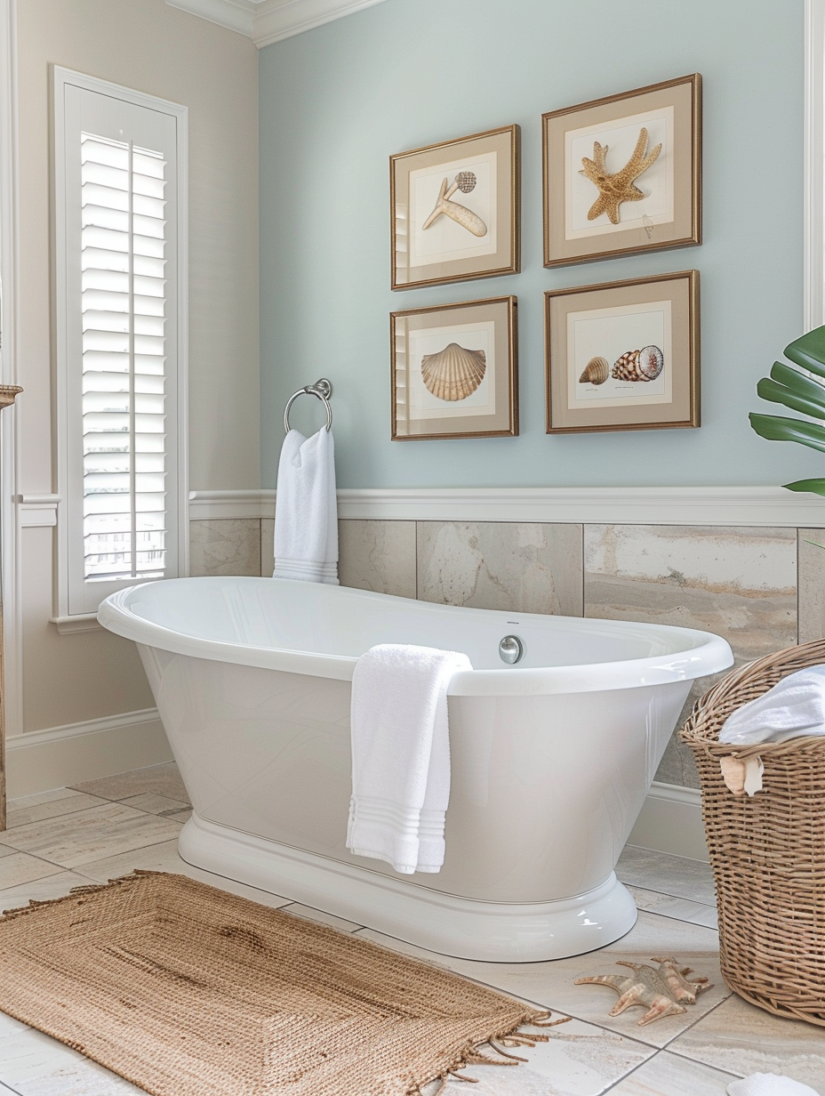 A coastal motif gives the feeling of a seashore escape. Frames in shades of blue, light green, and champagne should be included to awaken the beach. Factor-in natural materials like wood and stone, and throw in nautical decor covers such as seashells, ropes, and marine life artwork. This type is ideal for producing a serene and comforting environment.