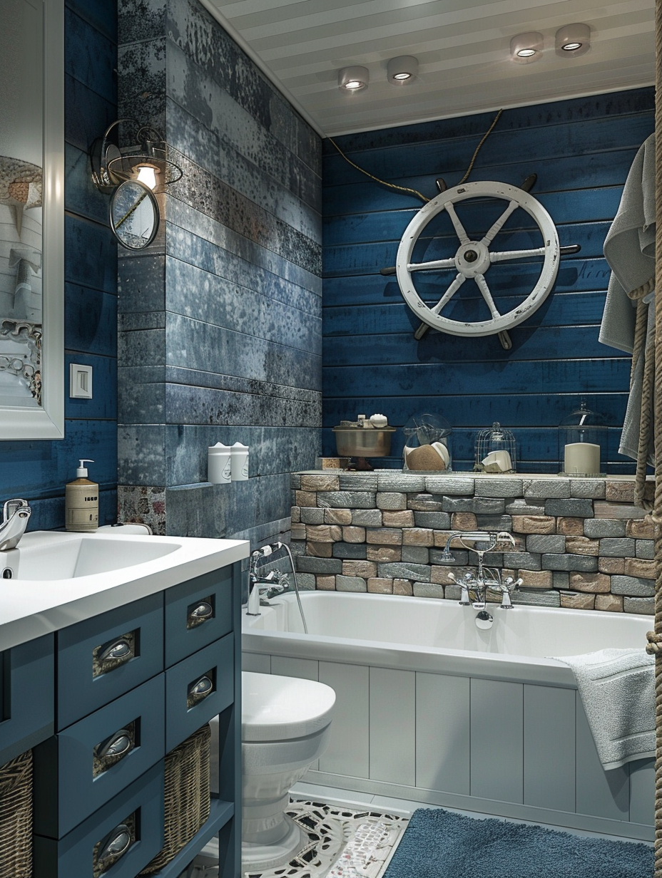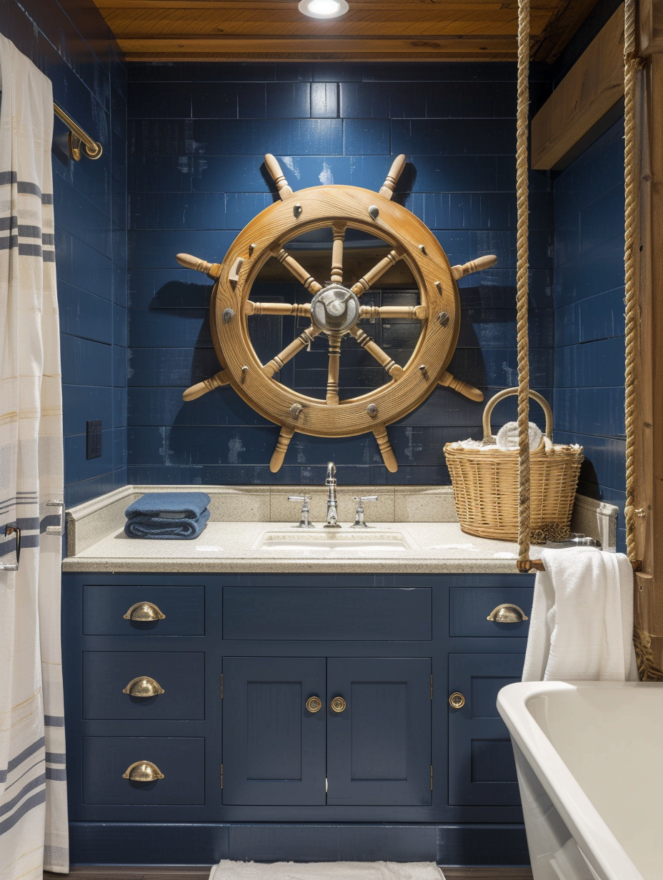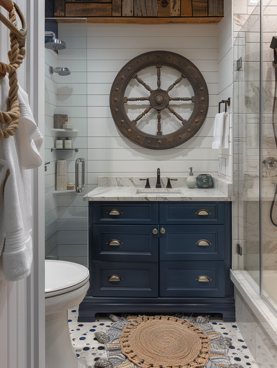 Nautical-influenced bathrooms bestow the soothing spirit of the sea to your home. Just imagine the navy blues, crisp whites, and sandy beige accents. Embellish the maritime look with marine-themed elements such as ship wheels, anchors, and rope details. Among them, a porthole mirror or a seaside art piece can do the trick. The theme brings about a peaceful and calm setting, thus becoming the most suitable for your leisure time.