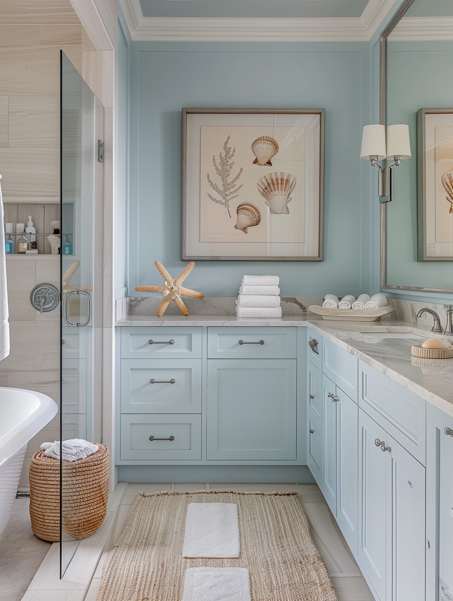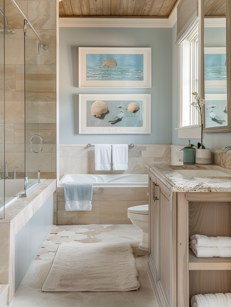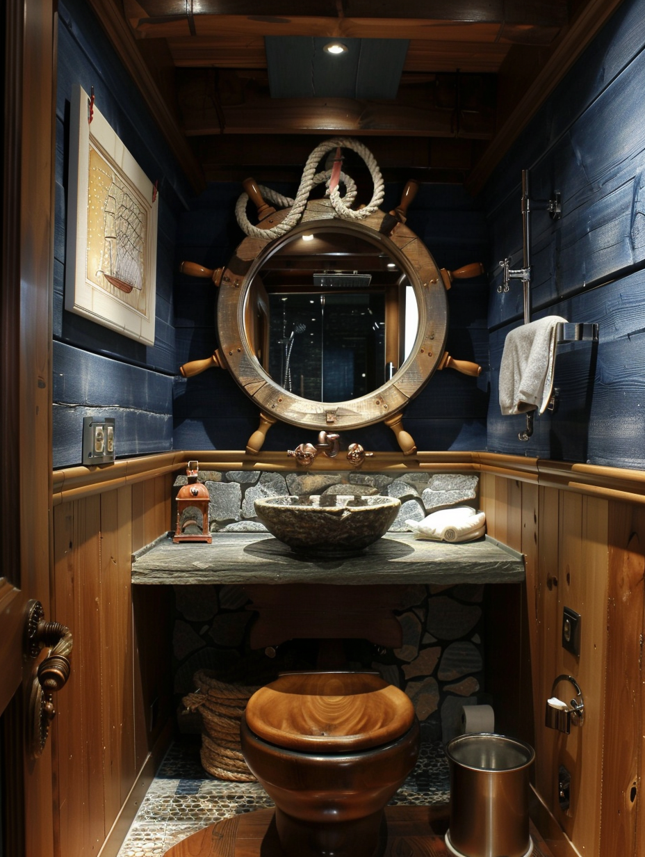 Nautical-influenced bathrooms bestow the soothing spirit of the sea to your home. Just imagine the navy blues, crisp whites, and sandy beige accents. Embellish the maritime look with marine-themed elements such as ship wheels, anchors, and rope details. Among them, a porthole mirror or a seaside art piece can do the trick. The theme brings about a peaceful and calm setting, thus becoming the most suitable for your leisure time.
