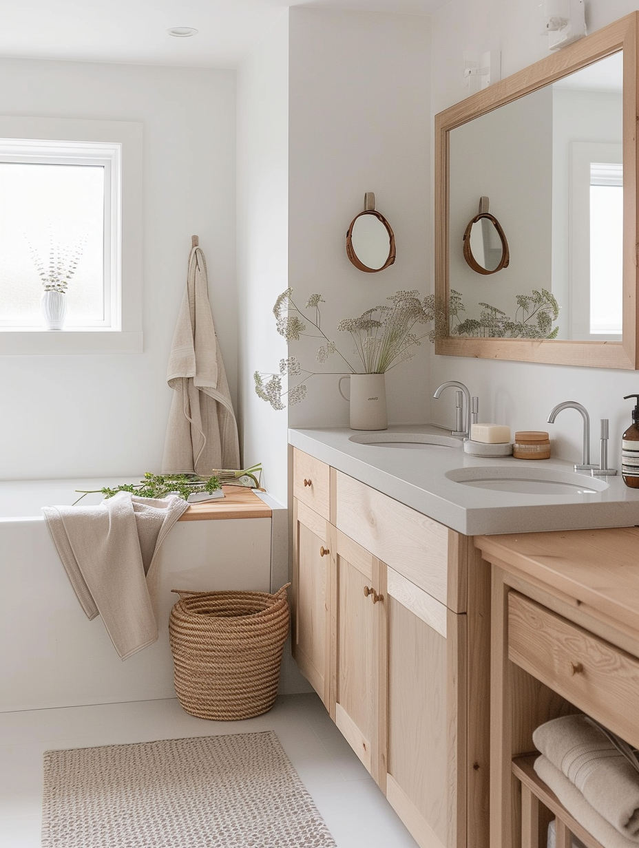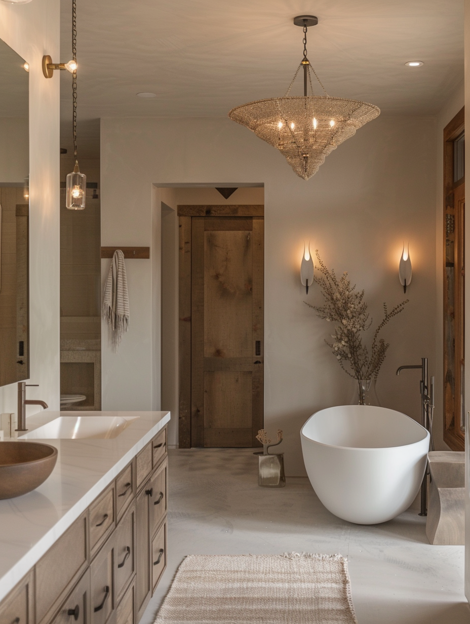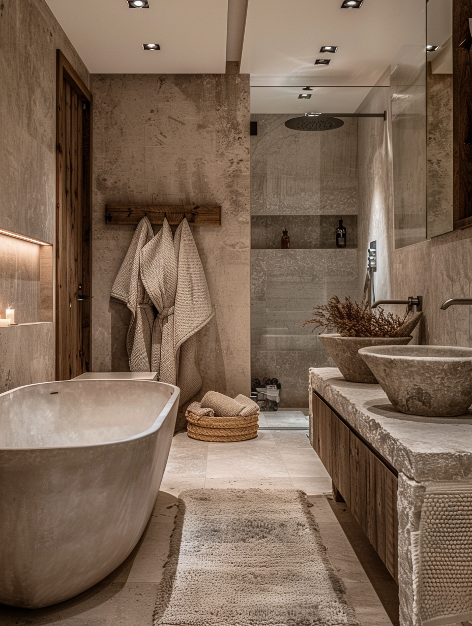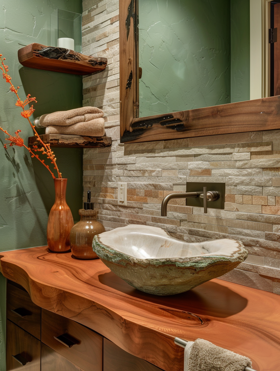 Colors inspired by the earth such as terracotta, sage green, and warm browns are used to form an association with nature. Use colors like those painted on the earth, such as terracotta, sage green, and warm brown. Stone, wood, and clay can be seen everywhere. Vessel sink, wooden shelves, and a stone backsplash can aid you to reach the organic feel. The design achieved makes the room look cozy and welcoming.