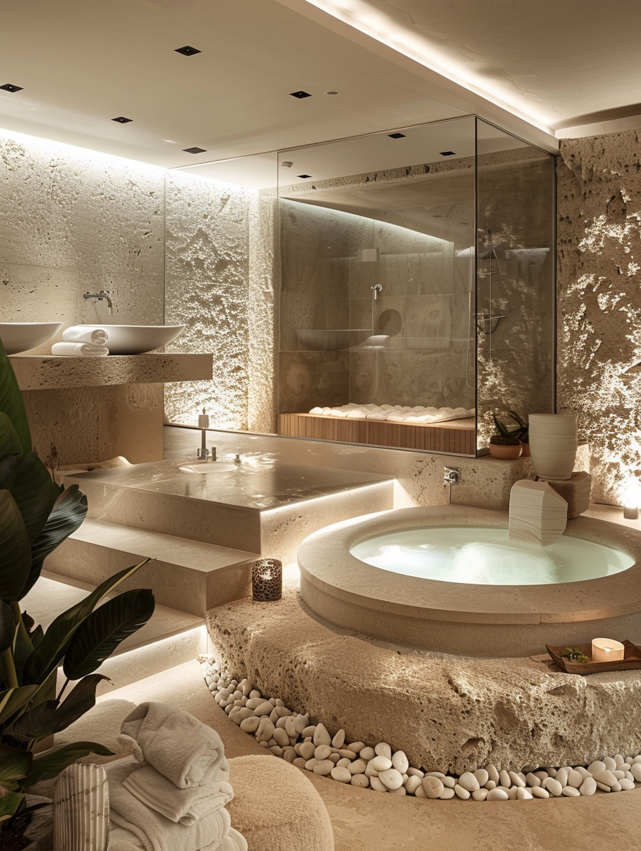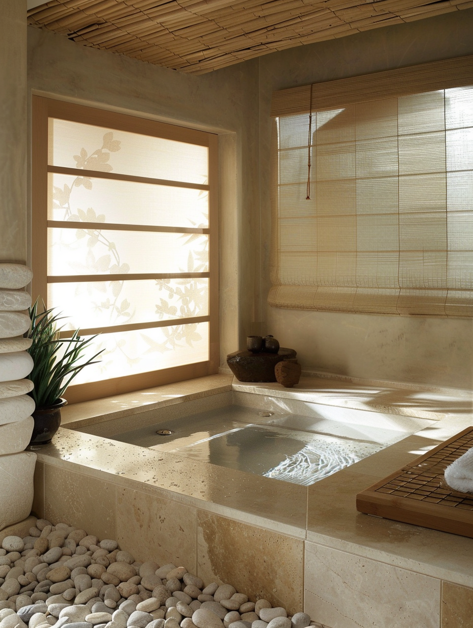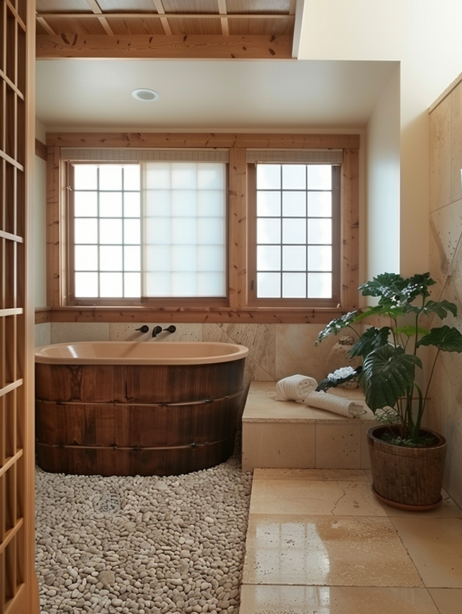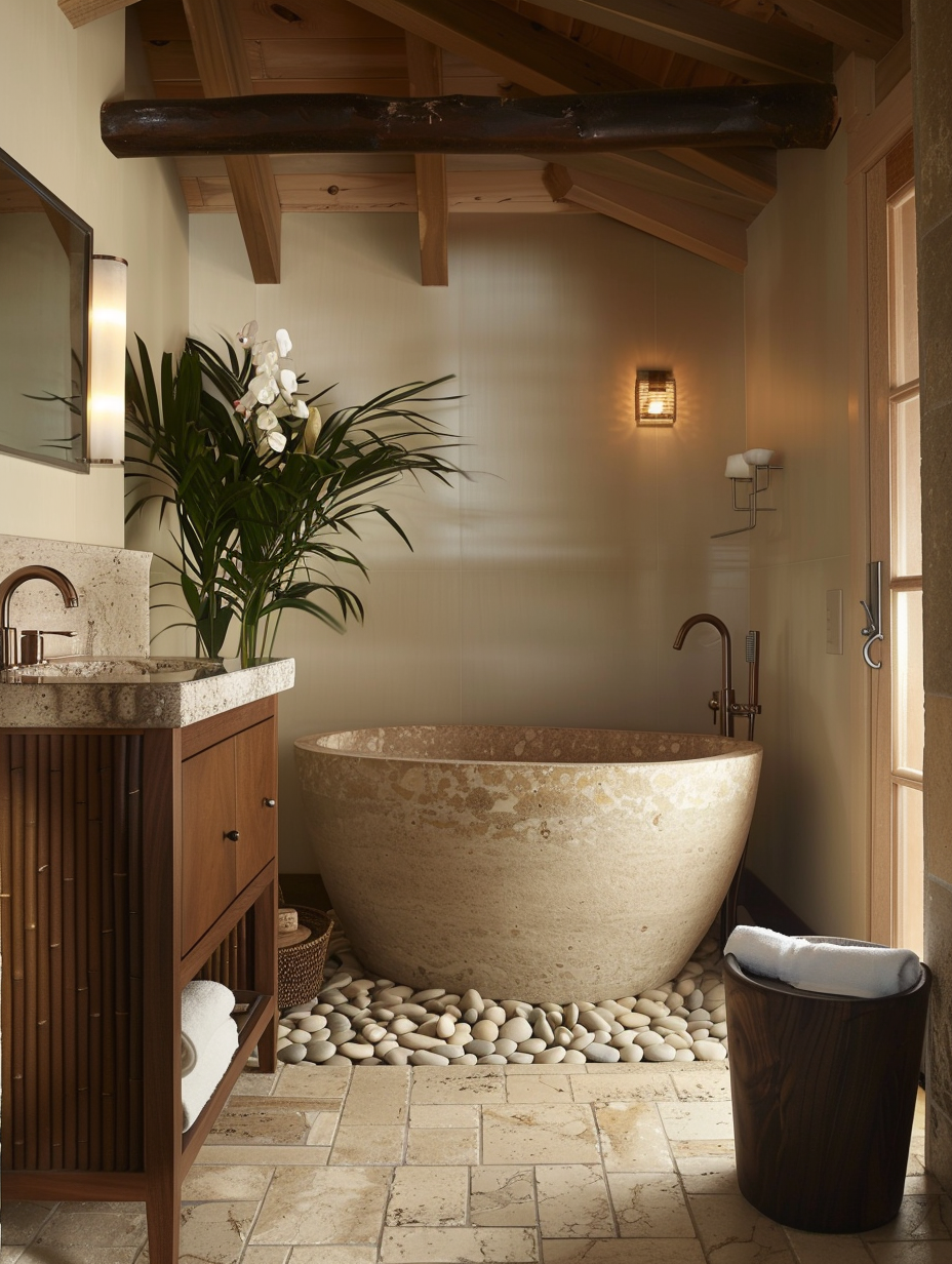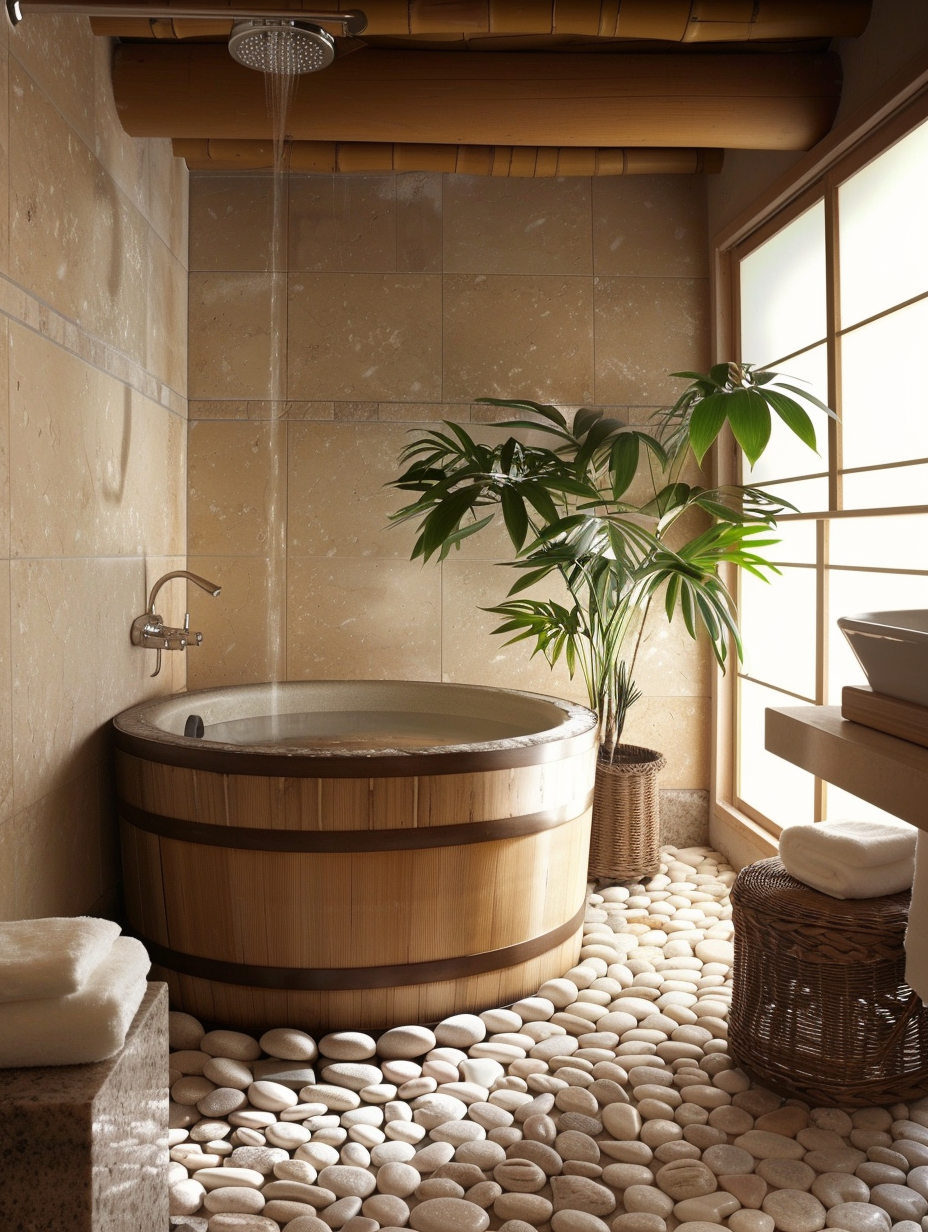 To advise on a Zen bathroom setting that feels calm and at peace, uses a palette of natural colors such as beige, gray, and white. You need to bring in natural finishes like bamboo, stone, and wood. A simple design and clean surfaces with no mess are important. For example, a Japanese soaking tub, a pebble shower floor, and potted plants are all good elements to add to the calm atmosphere.