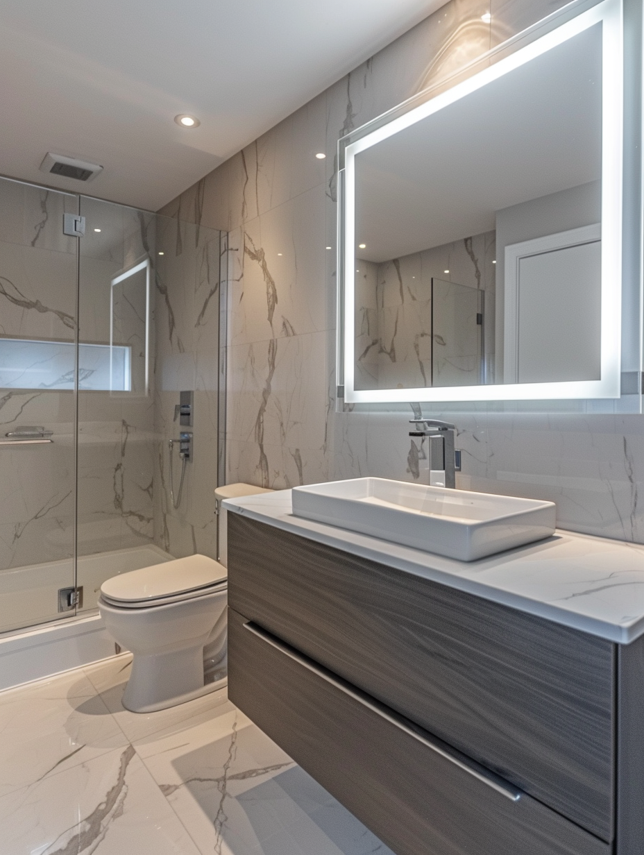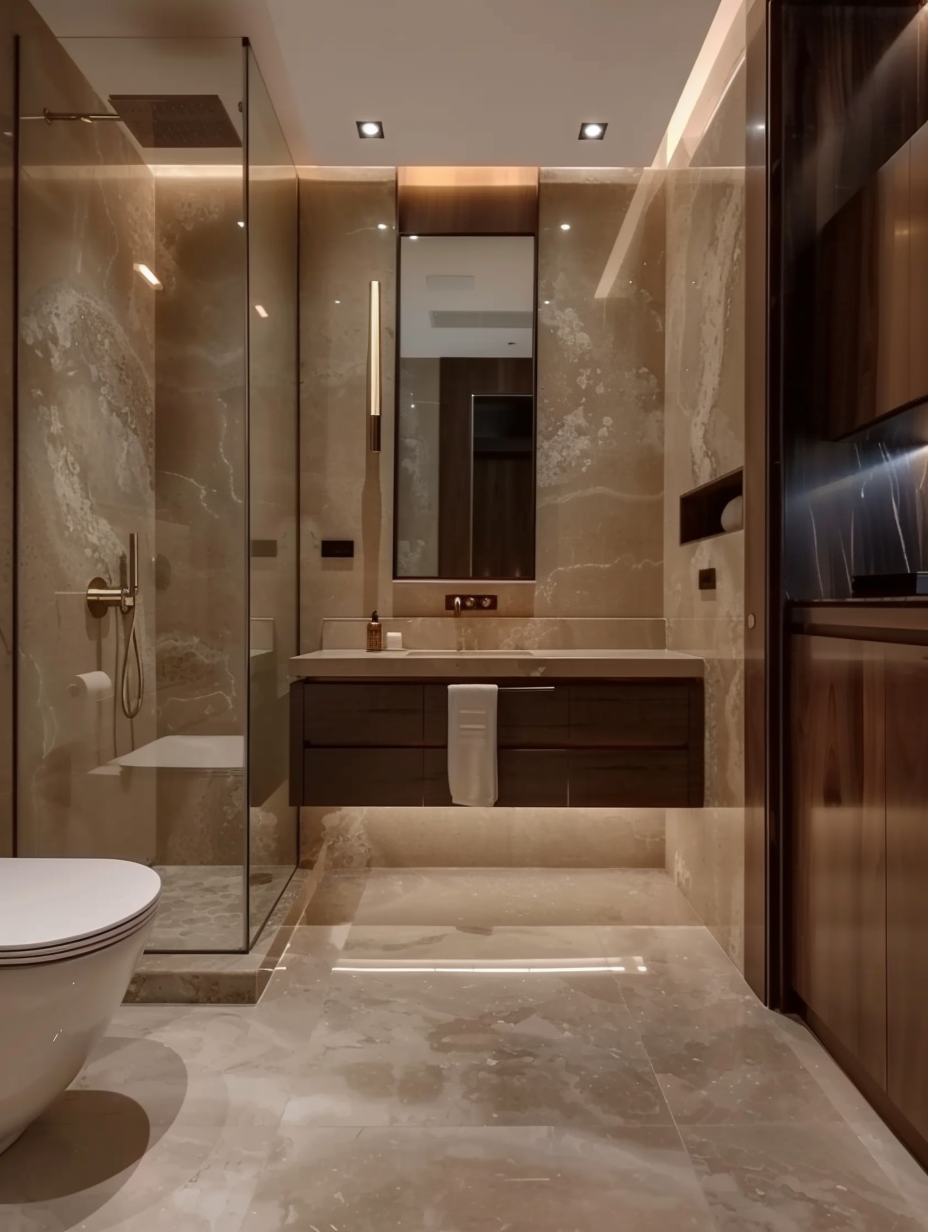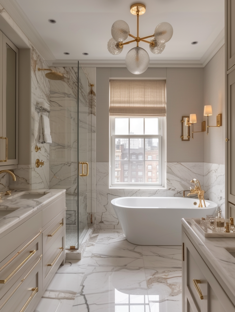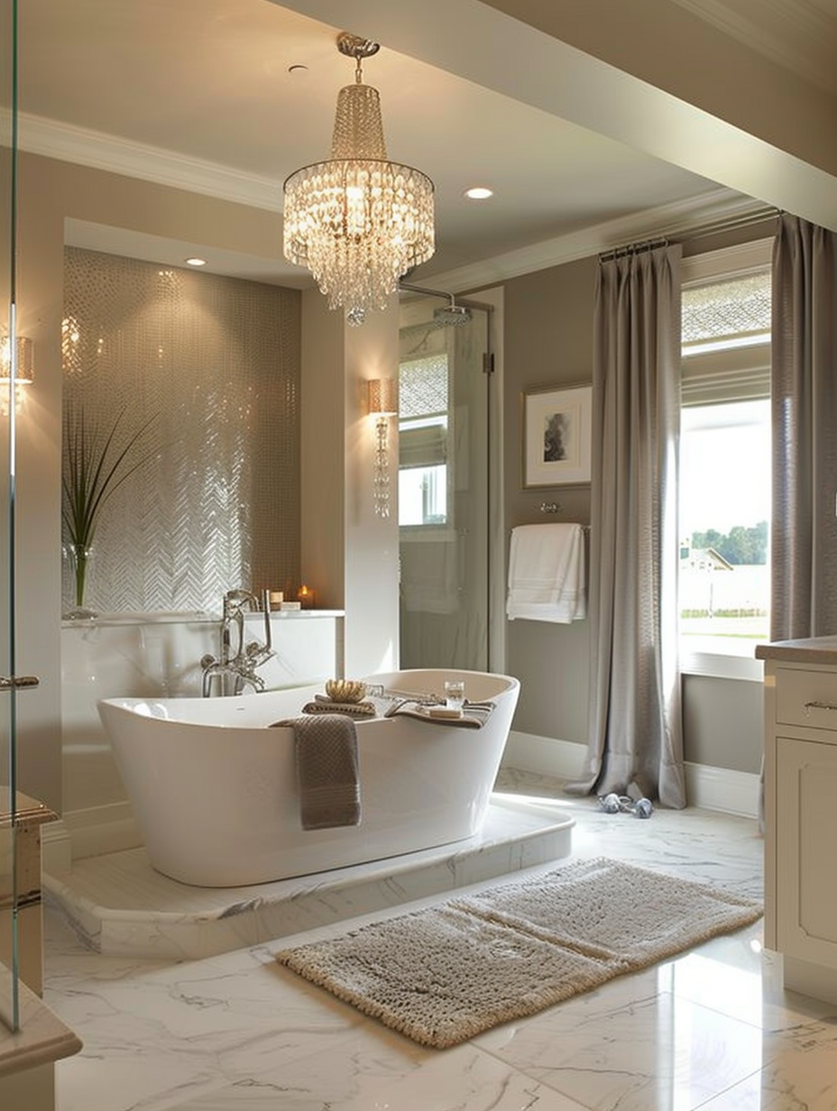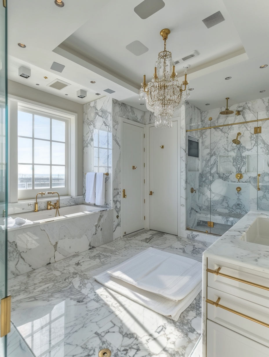 Marble finishes are a hearing of luxury and sophistication to any bathroom. Deeper into marble by the countertops, walls, and flooring. Couple with high-end accessories such as gold or brushed nickel faucets and a statement chandelier. A marble shower or a stand-alone marble bath tub can be singled out as the most important attributes of the room. This feature communicates the notion of luxuriousness and sophistication.
