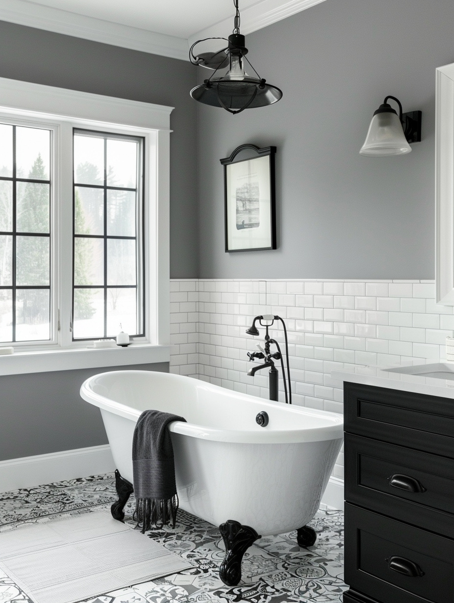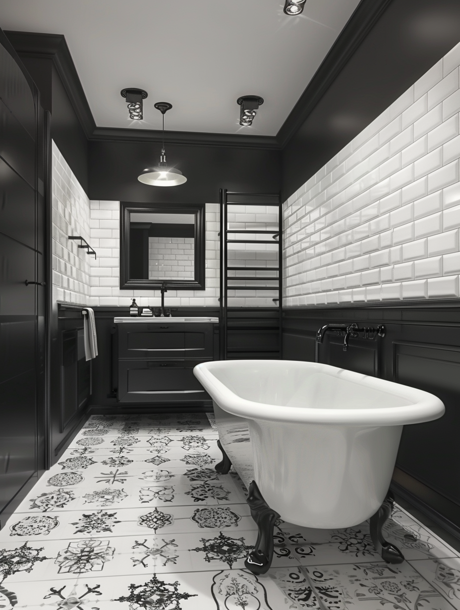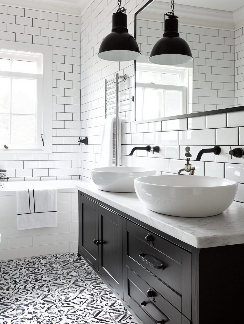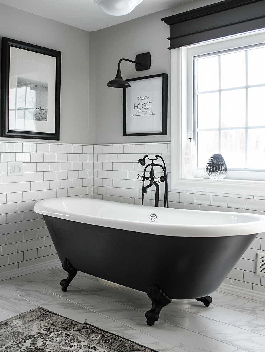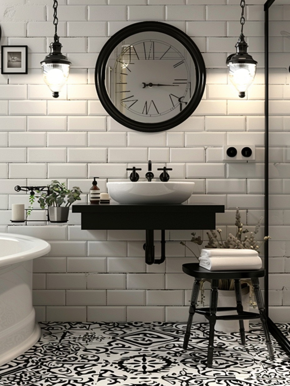 A timeless and elegant bathroom is depicted through a classic monochrome design. Create a black and white color scheme with different shades of gray for a more three-dimensional decor. Black fixtures and accessories may offer a dramatic contrast to white walls and tiles. This monochromatic style is modern as well as very practical indeed.