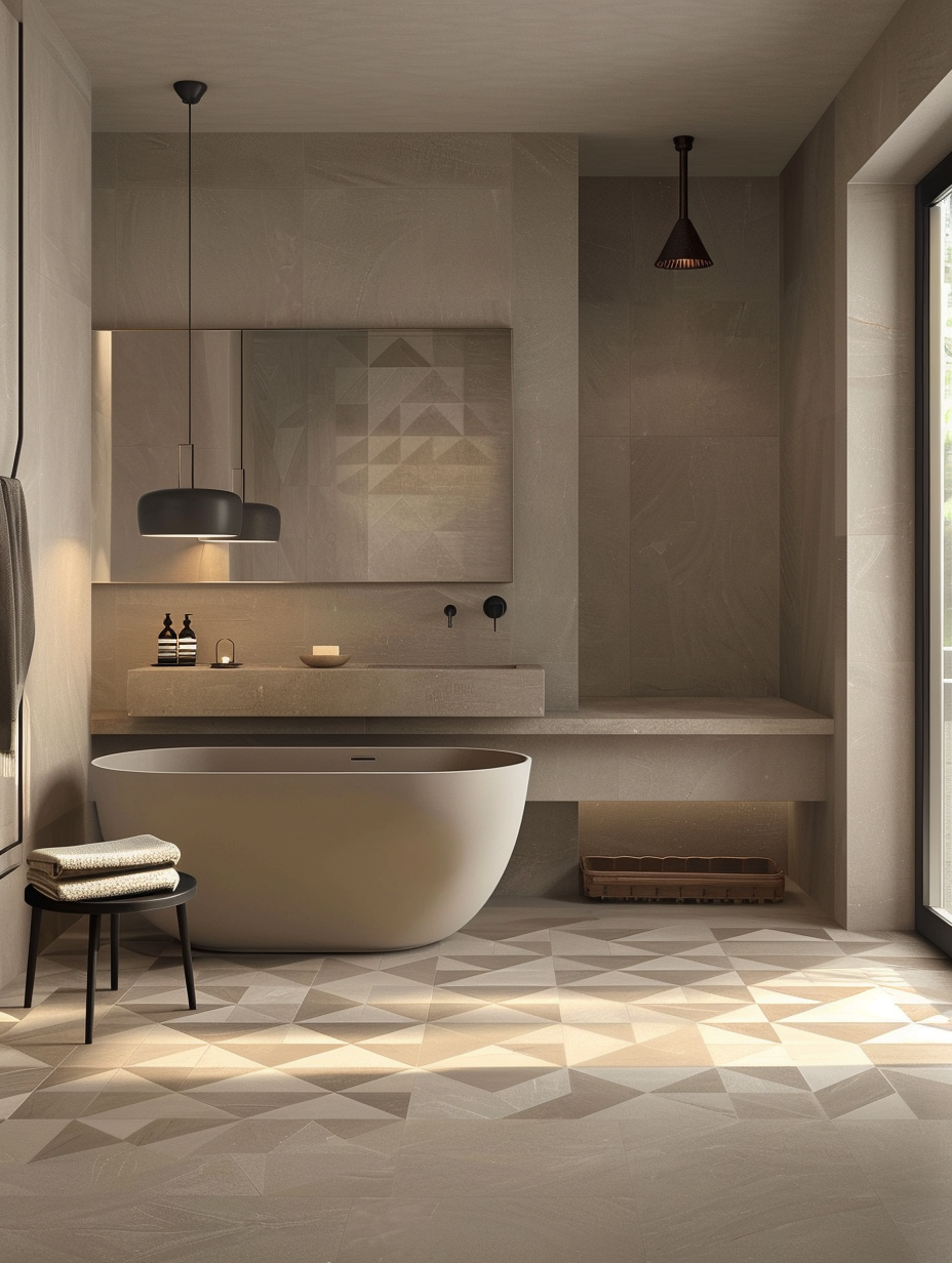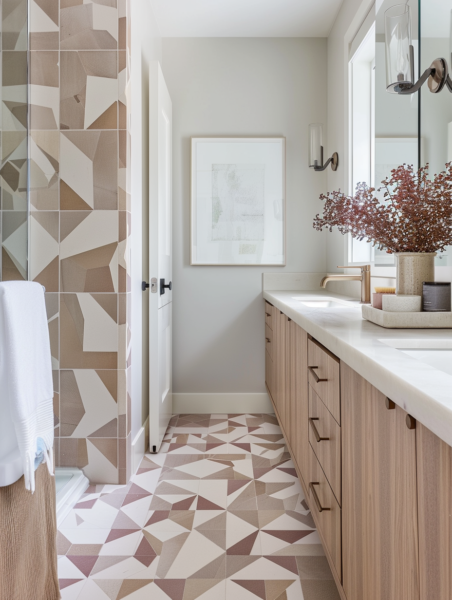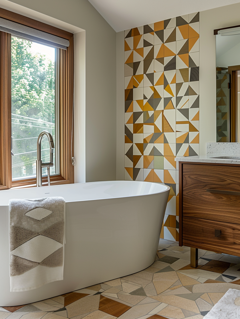 The inclusion of geometric patterns and shapes can bring a new and energetic look to your bathroom. Include geometric tiles in the field; angular fixtures and accessories should be your choice. Not only does this design create a unique visual appeal but it also makes a bold statement. Complement with a neutral color palette to make things look even better.