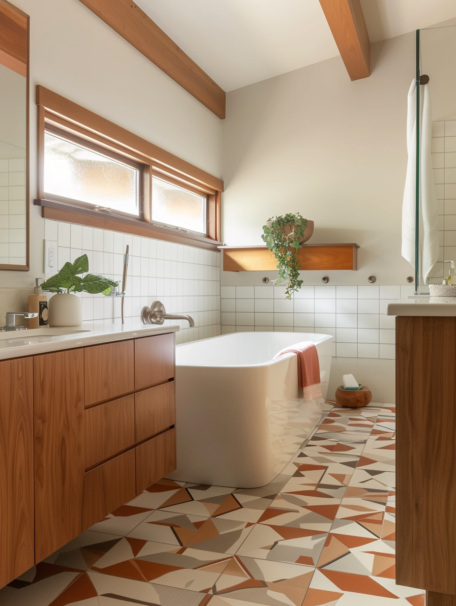 Mid-century modern design merges charm and utility. With straight and fluent lines, natural curvature, the combination of both conventional and subversive materials, this is a perfect bathroom style for the sophisticated. You are advised to pick warm wood tones, geometric tiles, and sleek fixtures. A freestanding bathtub and floating vanity finish the sense of levity. A long-term and happening space is the best.