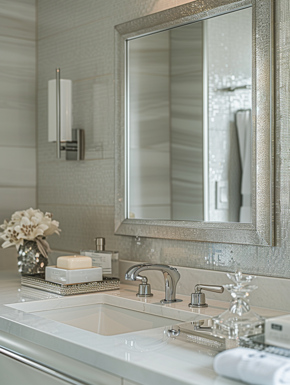 Introducing metallic finishes may enthrall your bathroom with a sense of luxury and sophistication. Use finishes like brushed nickel, chrome, or gold for fixtures and accessories. Your bathroom may have a metallic-framed mirror or light fixture that can be the center of attention. These accents are experienced to be compatible with both modern and classic designs, which give a slim and polished look.