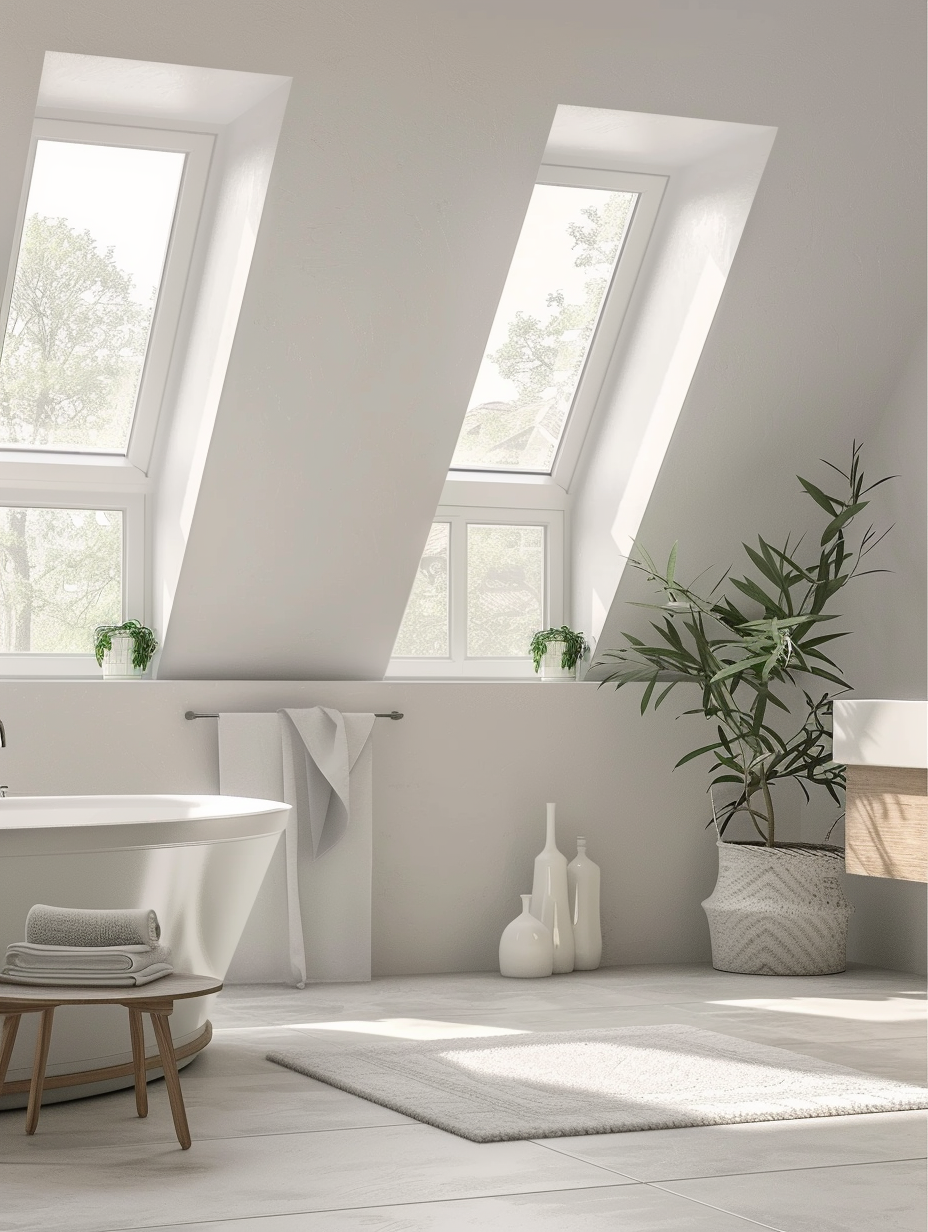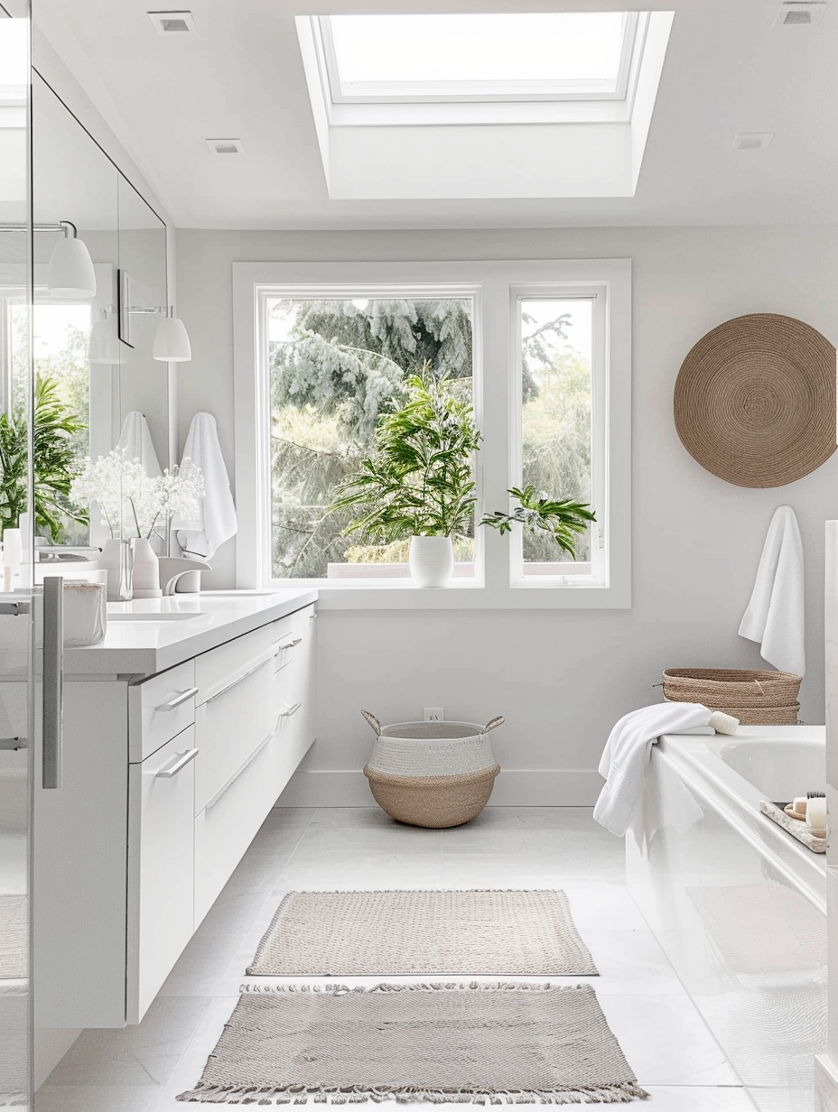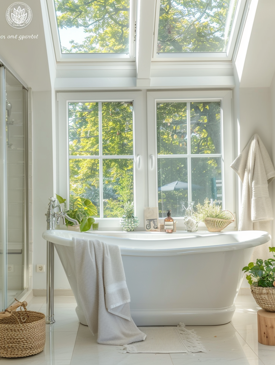 A light and airy bathroom result in an uncluttered and opened atmosphere. Try various shades of white, light gray, and the soft blue breaks up this space. Having large windows or skylights will draw in the natural light which will help the place lighter. Go for minimal decor and fixtures to give the room a clutter-free look. This layout image is suitable for a light and welcoming space.