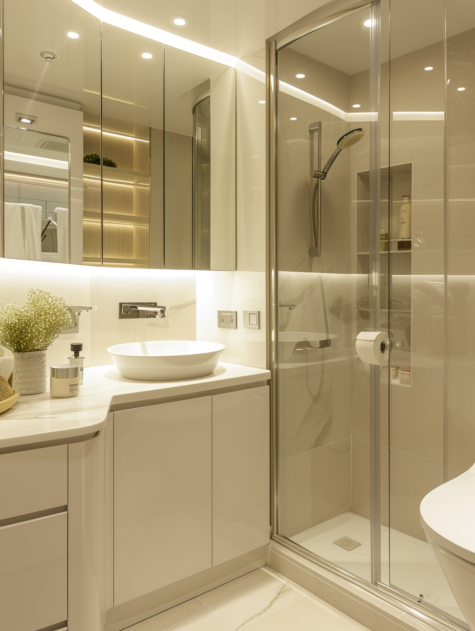 Small bathrooms are required to have a compact but functional design. Such as a wall-mounted sink, compact storage units, and corner showers. Get a shower instead of a tub if you want to be thrifty with space. Utilize light color and mirrors to achieve an enlarged space visual effect. This project combines great convenience and fantastic design in such a small space.