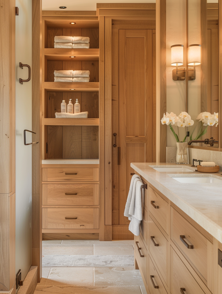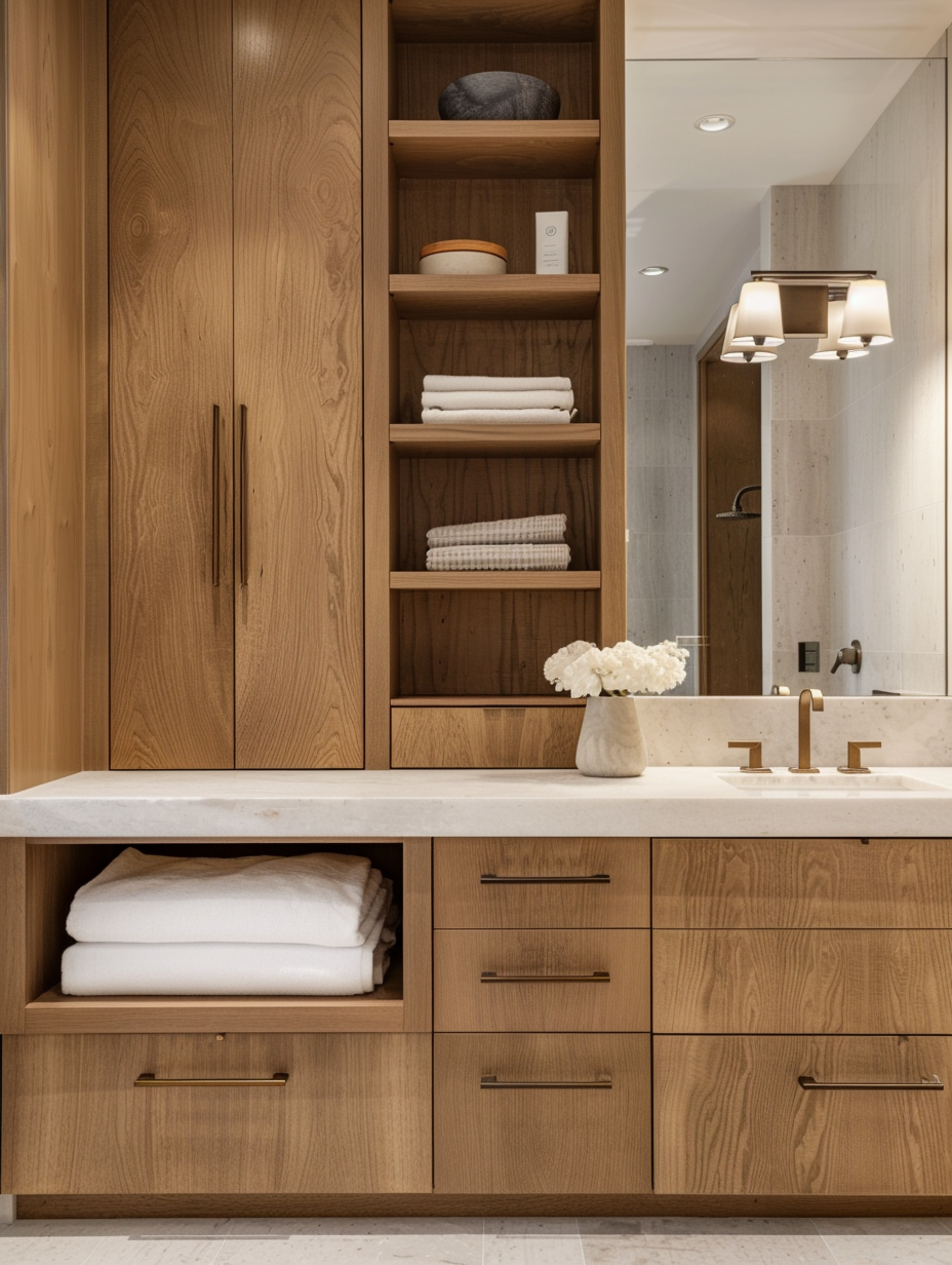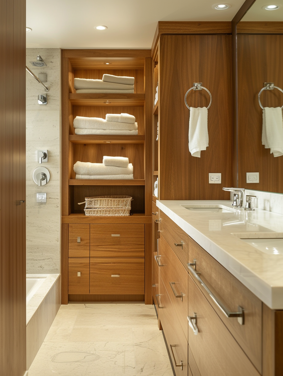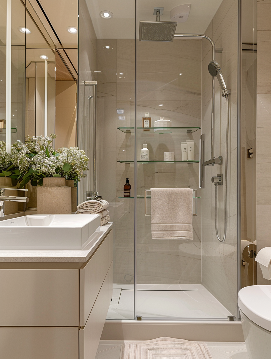 Save space and keep your bathroom tidy with the help of intelligent storage solutions. Opt for built-in shelves, medicine cabinets, and drawers on vanity units. The over-the-sink storage and built-in niches in the shower will be the place to store any extra items. These options are ideal for creating convenience and style at your home.