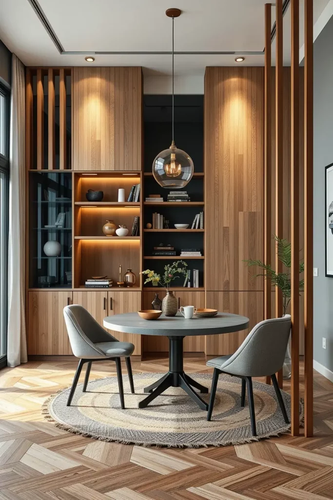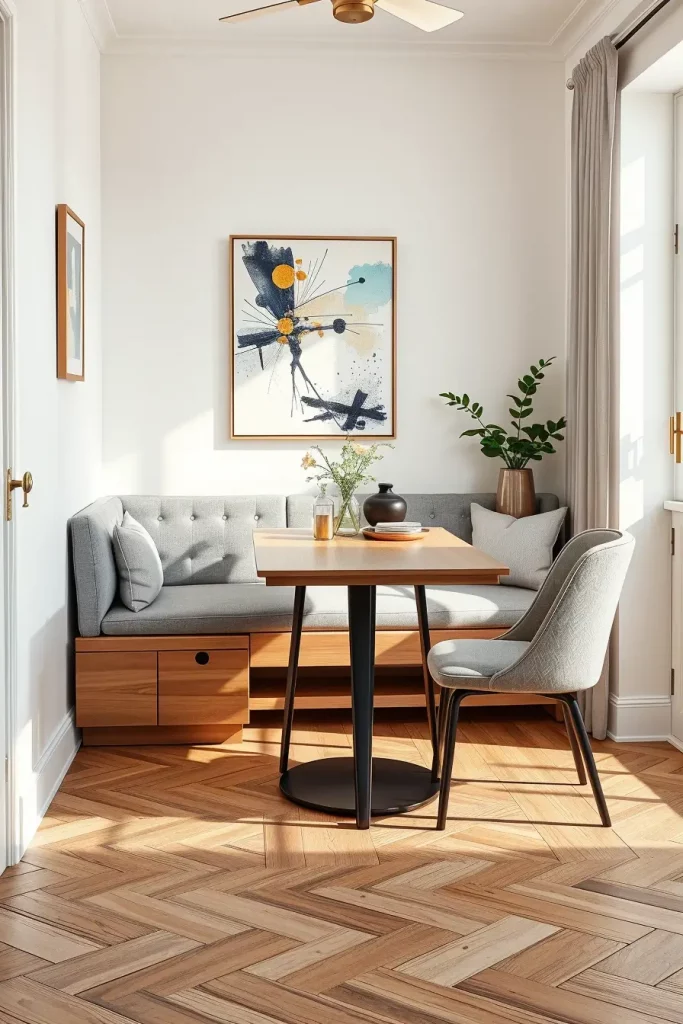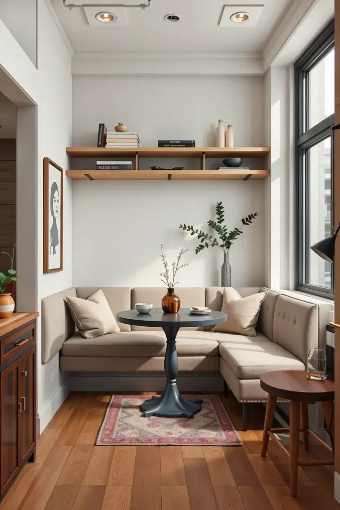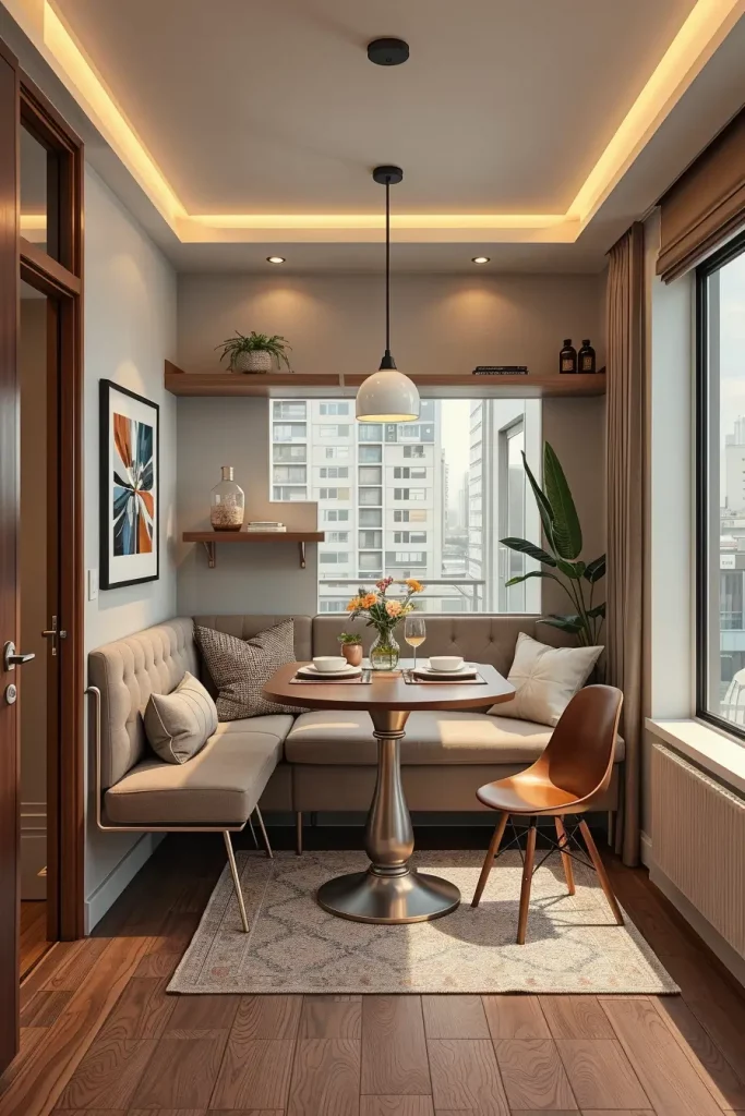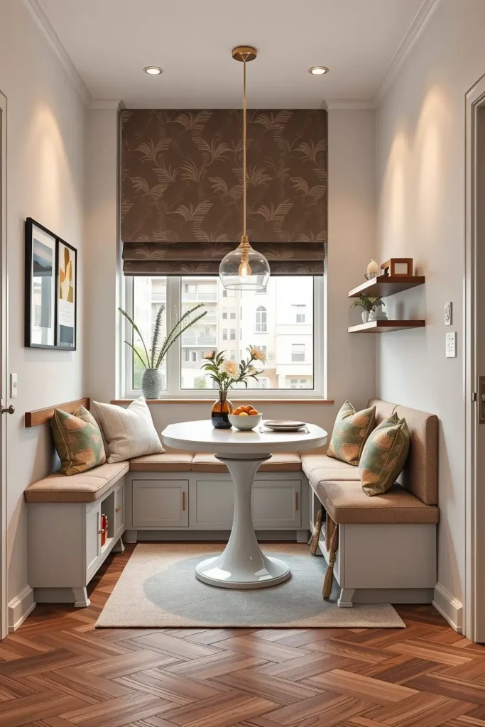 Sometimes, built-ins are the method I recommend most when planning dining areas in in small apartments. Having a niche table with storage beneath it or shelves or cabinets, will convert an underused corner into a handy dining area. It mixes the look and the purpose of the place, making the most of the area even without looking crammed together.