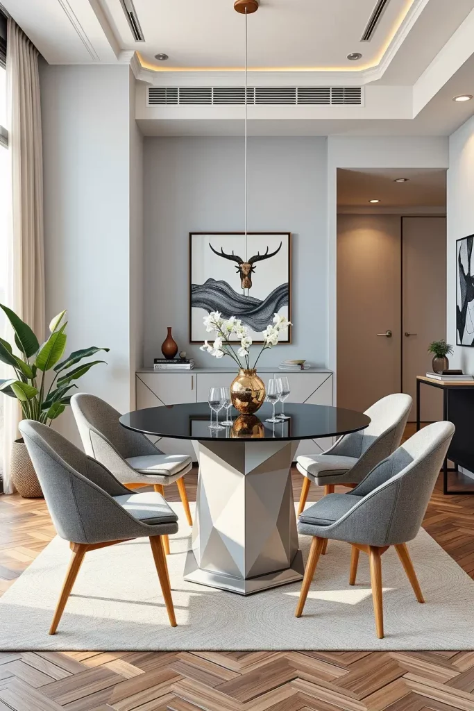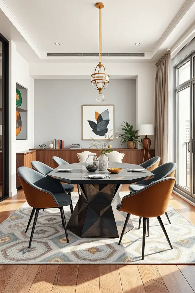 Apartment dining areas can make great use of geometry as a design tool. I regularly use angled or rounded shapes to set up a sense of pace and order. Bringing architecture into your space, try using a base with many sides, a hexagon-shaped top or chairs with angled chair backs. They combine their usefulness with their sculptural quality, bringing out the best in modern home décor.