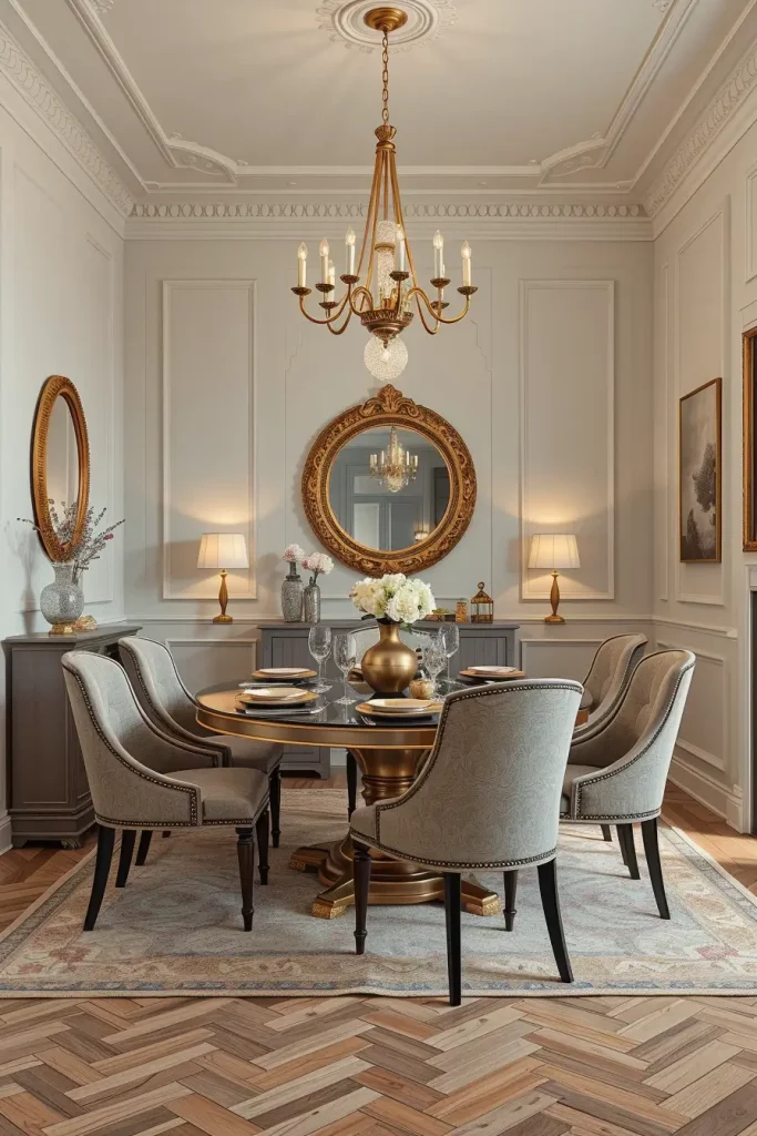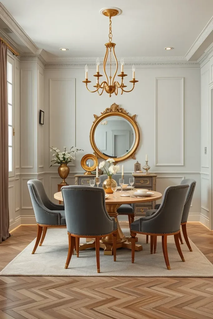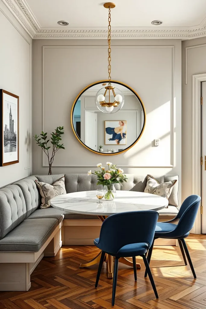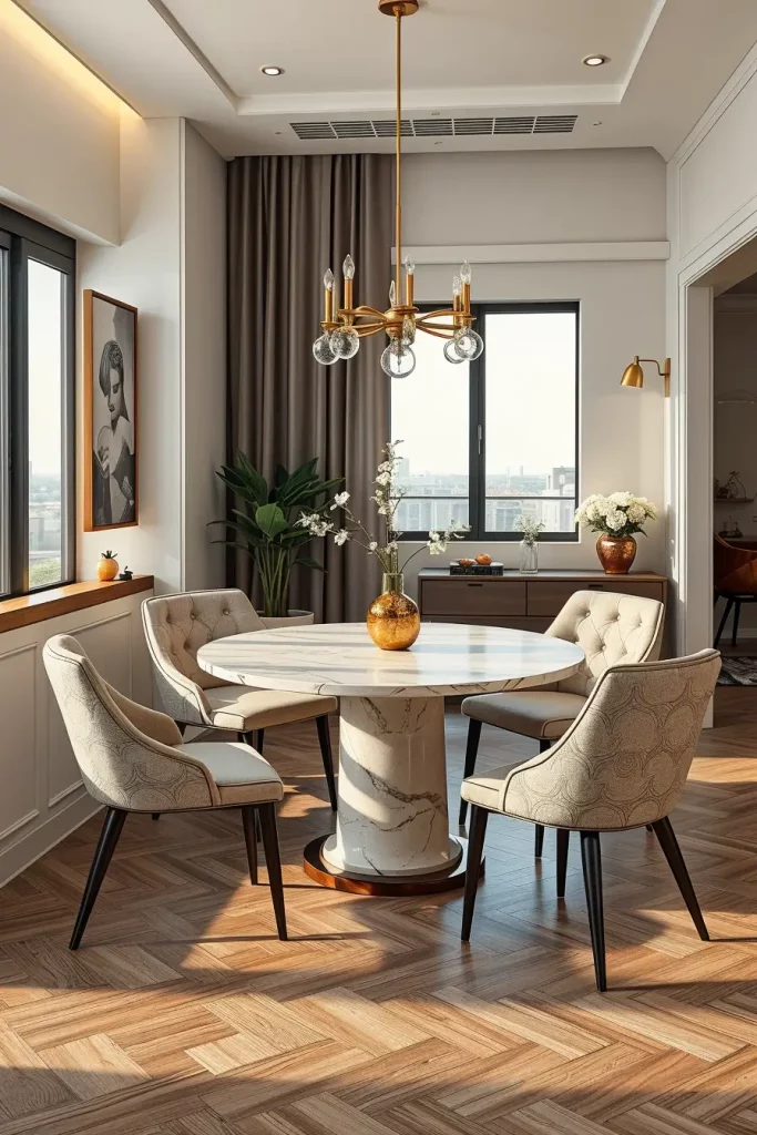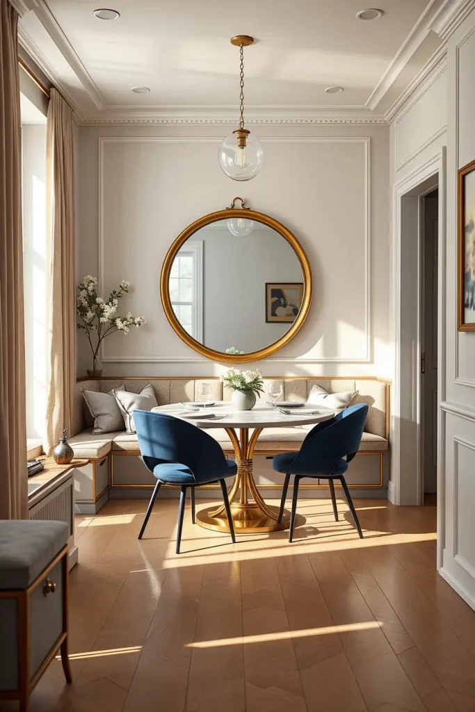A splash of gold or brass highlights and soft neutrals makes every eating area in an apartment look luxurious. This method is my choice when I want the style to be gentle. Neutral decorations provide a subtle background and metallic elements bring in touch and depth.