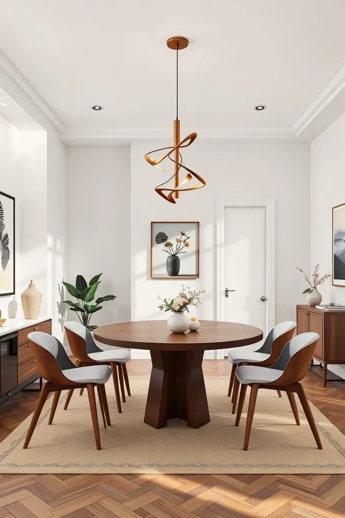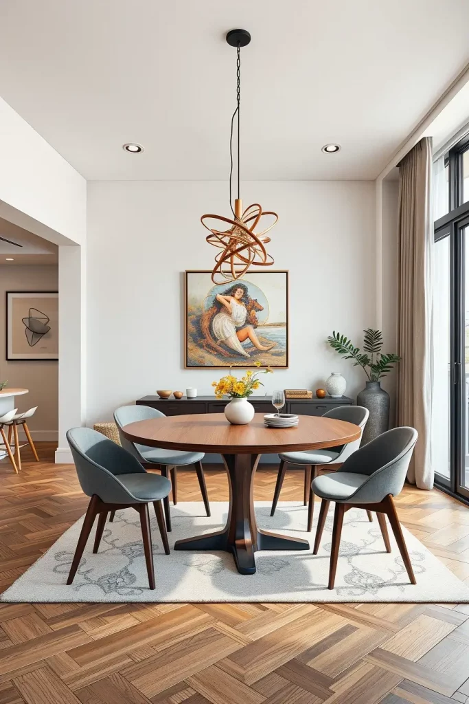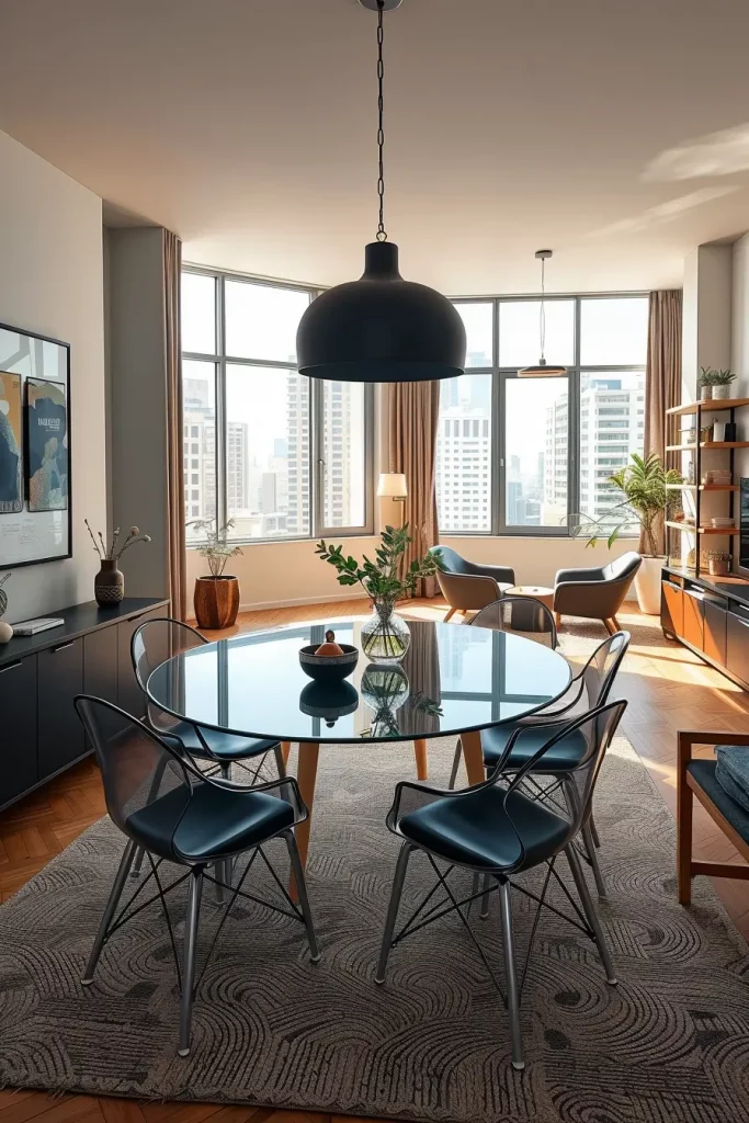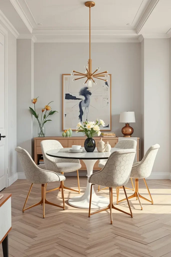 Pairing mid-century modern with contemporary glam makes the dining area in an apartment look special. The fashionable lines of mid-century furniture go well with the elegant materials of glam styling, resulting in an area that has a vintage style and is still fashionable. For me, this kind of music seems like it’s never gotten old and has only updated over time.