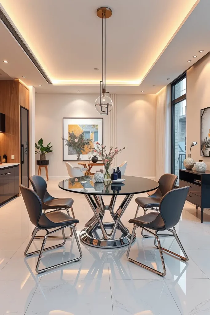 Adding glass and metal pieces to a dining room gives off a bold, contemporary style. Transparency and the use of reflecting elements make this idea fit well with today’s apartment dining room designs. Light-colored paint is perfect for gaps in space which makes allocating space better in small flats.