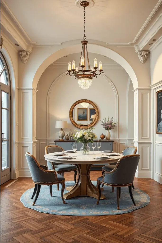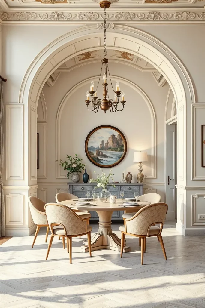 The dining table is placed under the arch, sitting by curved chairs and a small round light above. Curved sofas and artwork that suggests arches help create the look. Having an arched mirror in the room stretches out the view while keeping the design theme.