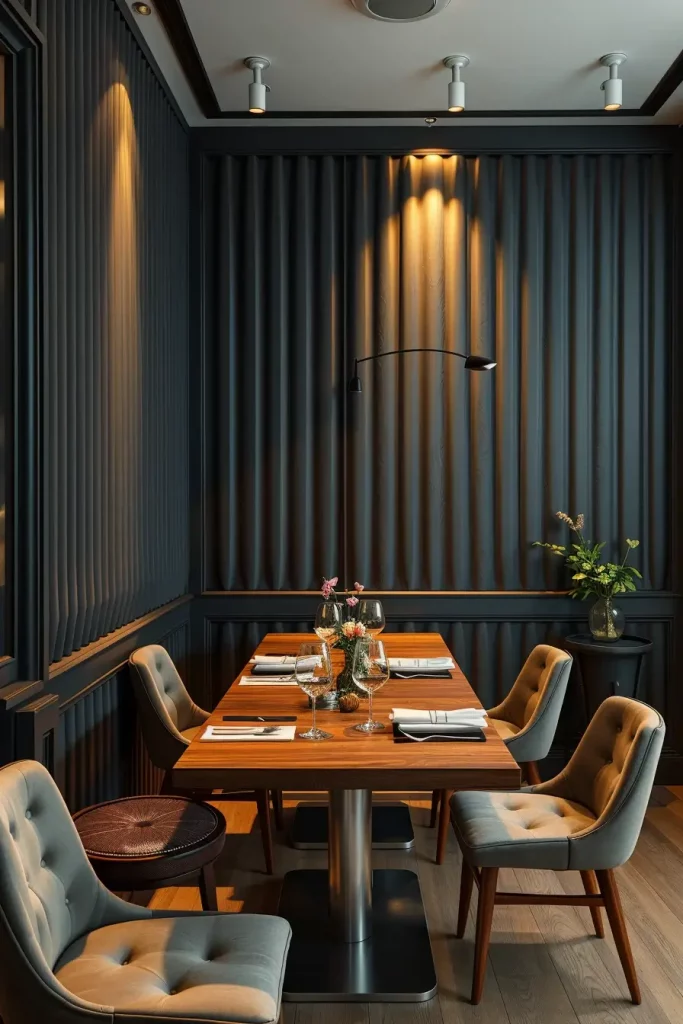 A lot of the time, I put in slatted wood panels finished in matte black or rich walnut behind the table. Dining areas can look much nicer when upholstered wall panels are included. They’re elegant to look at and can keep noise down to create a relaxing atmosphere. You can highlight the textures in your space with accent lights to create a boutique restaurant feel.