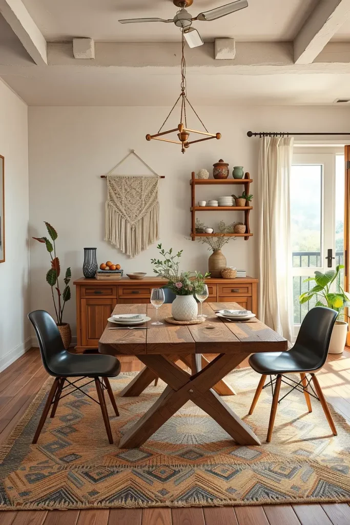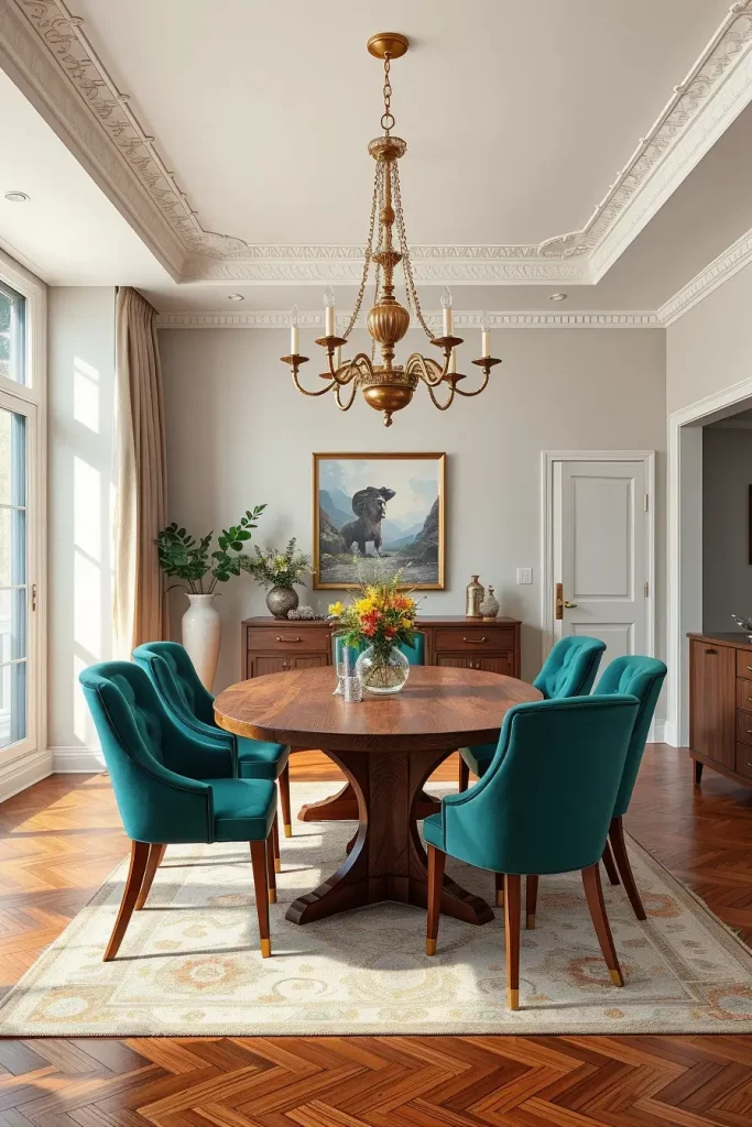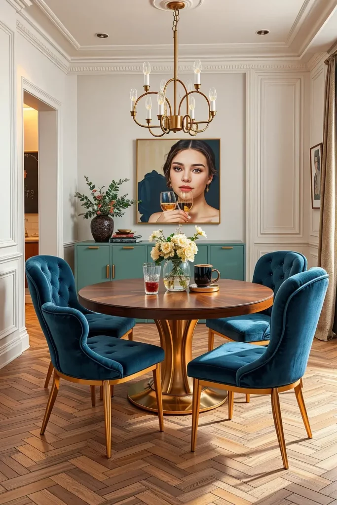 A walnut or teak dining table topped by tapered legs helps me bring out the charm of matching velvet or boucle dining chairs in emerald or sapphire. Details made from brass are found in fixtures, chair fittings and frames around artwork. To make it stylish, combine an old sideboard with brass legs and a large pendant above the pieces.