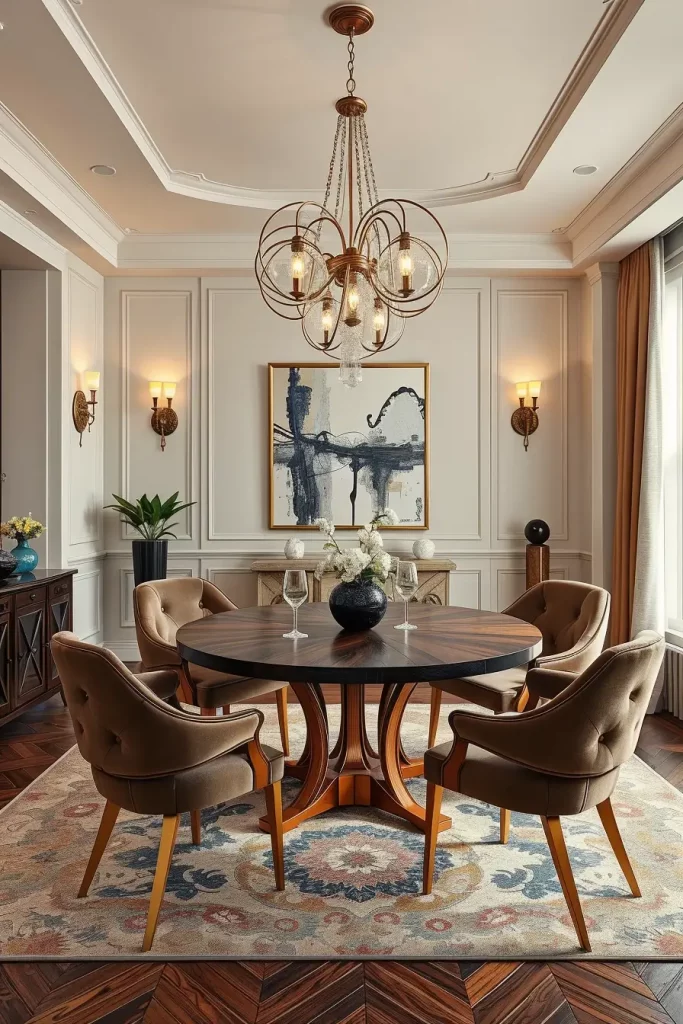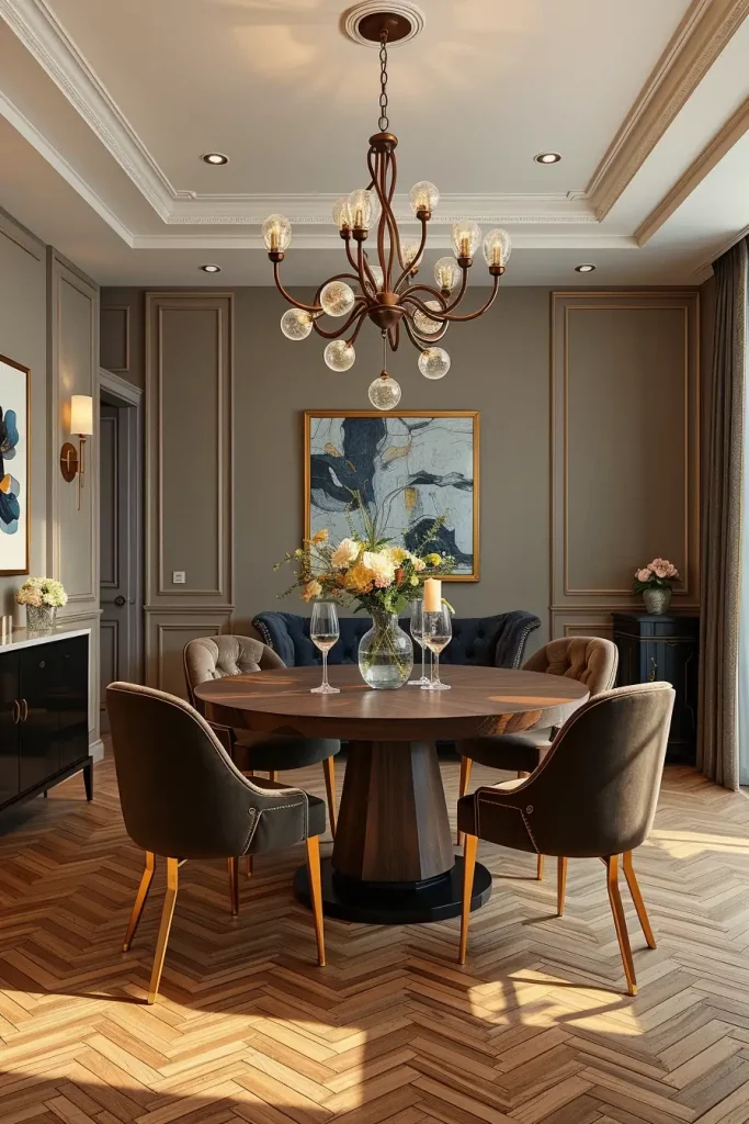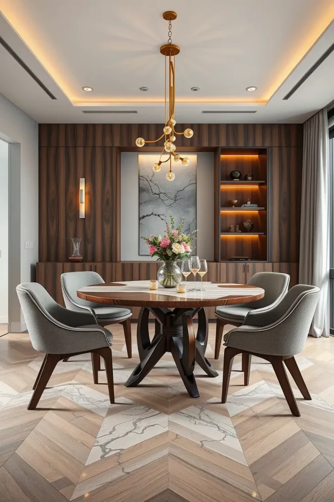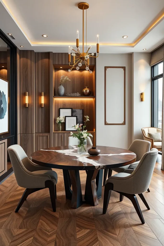 I usually work with a round table customized from dark-stained oak or marble composite, with asymmetric legs and have mid-back chairs made with upholstery and arched frames in the area. I make a shelving niche by hand where you can keep bottles and glasses and it can be used as a small bar or display. With their unique design, the light fixtures on the walls both add beauty and make the dining area comfortable and welcoming.