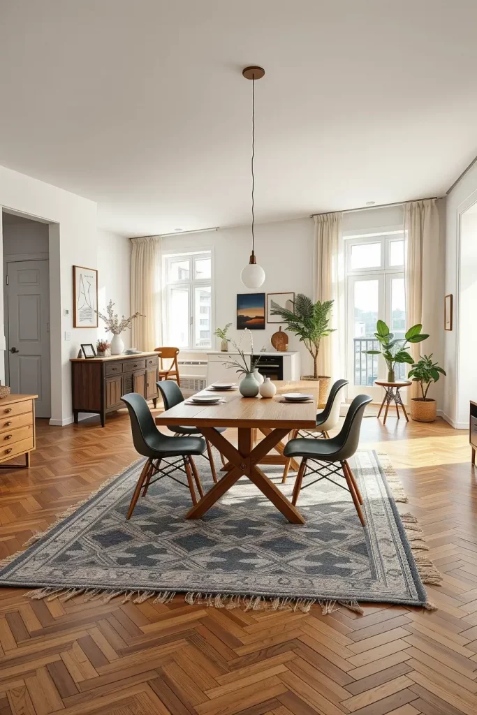 When apartments do not have walls dividing rooms, rugs are perfect for creating a separate place for dining. Picking the right rug ensures the table and chairs stay put, the room is quieter and everything looks more inviting. I usually encourage investing in one that is sized and styled to fit with the furniture and look of your space.