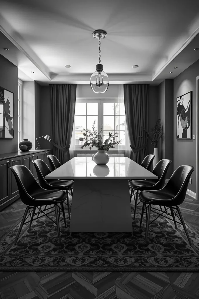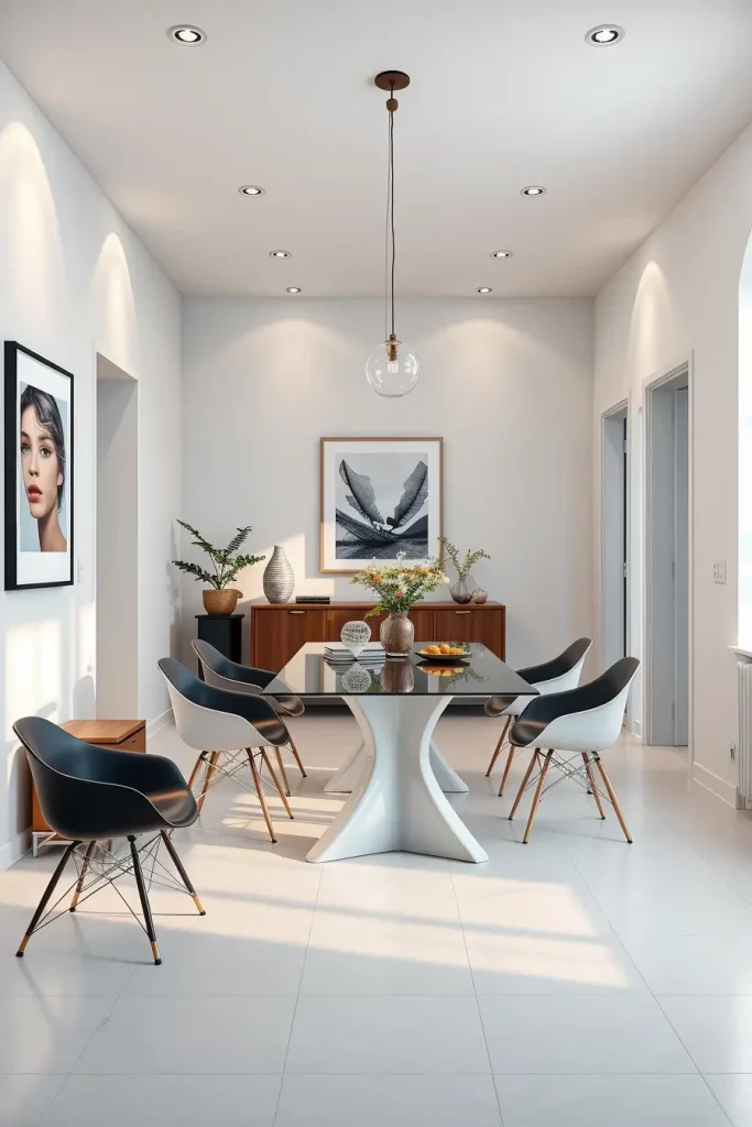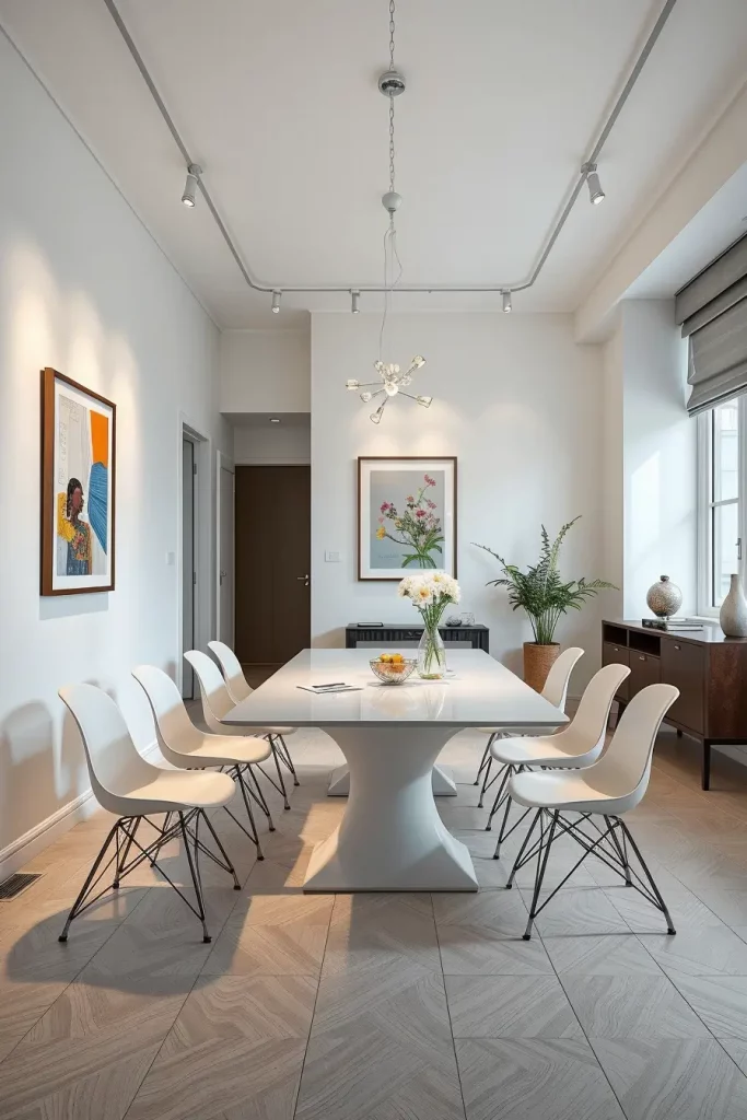 I typically recommend using matte white or soft gray walls, accompanied by a narrow solid surface table (stone or resin) with sleek legs. If you choose dining chairs upholstered in a single color, for example molded fiberglass or linen-wrapped ones, the design will feel like something out of a museum. Putting track lighting above the table allows one to light wall art, using the wall like a background for an exhibition.