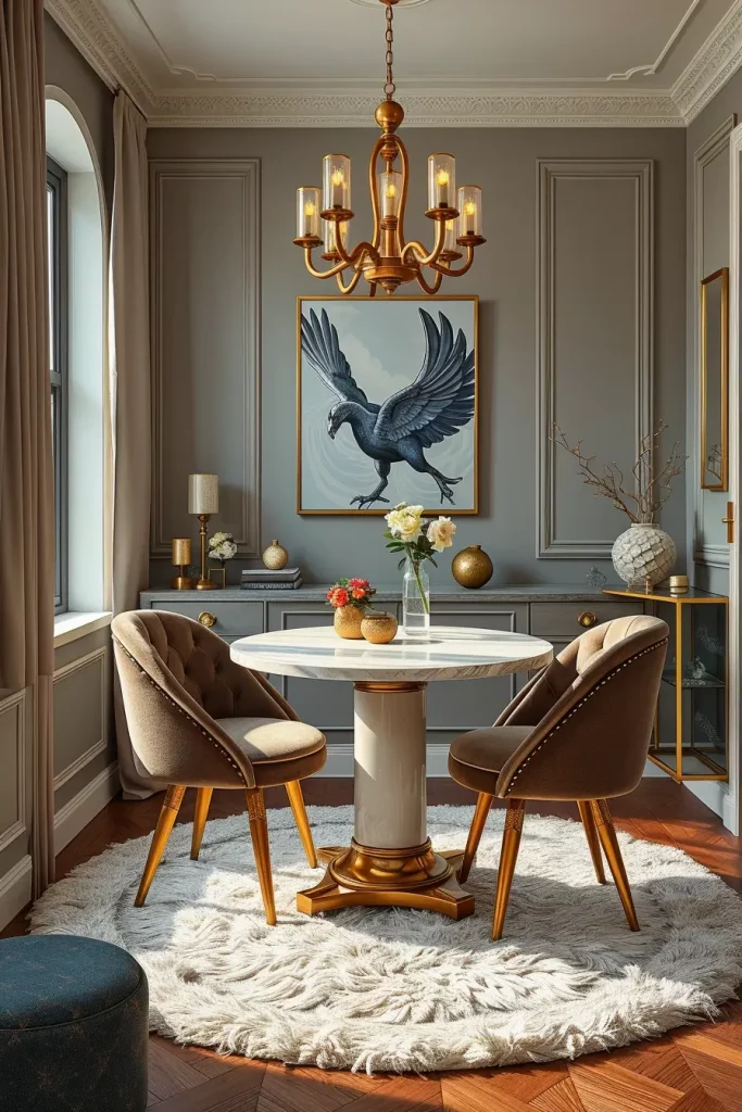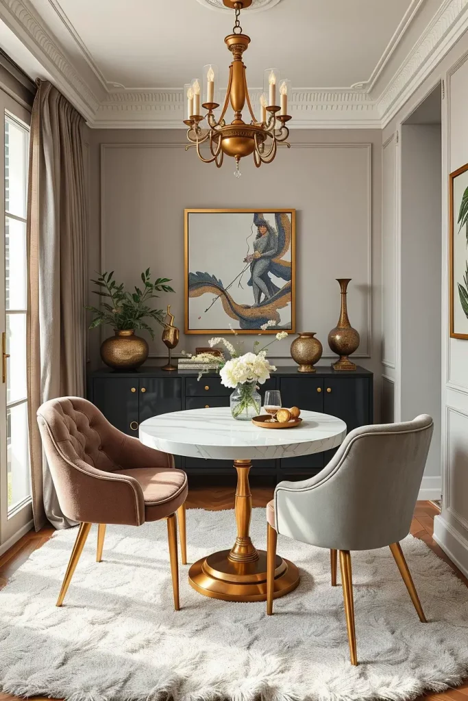 For this kind of design, I always pick a round table done in faux marble, two chairs covered in velvet with golden legs and a rug underneath. I use sculptural candleholders or glass glass domes to make the middle look elegant. Mounted scones or a compact chandelier can make your space elegant without taking too much floor area.
