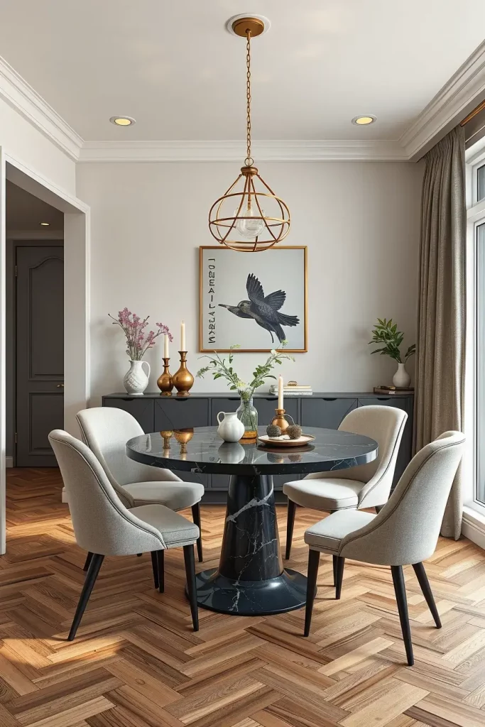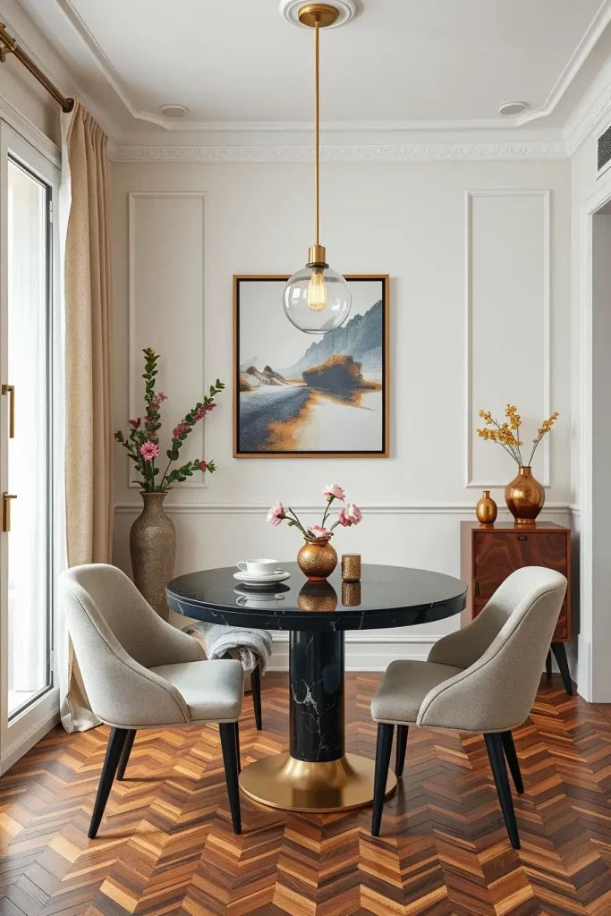 A pretty dining area with limited space requires choosing rich and special materials thoughtfully. With every inch valued in a small apartment, opting for luxurious finishes like stone, velvet or matte brass can make the place look great while remaining clean.